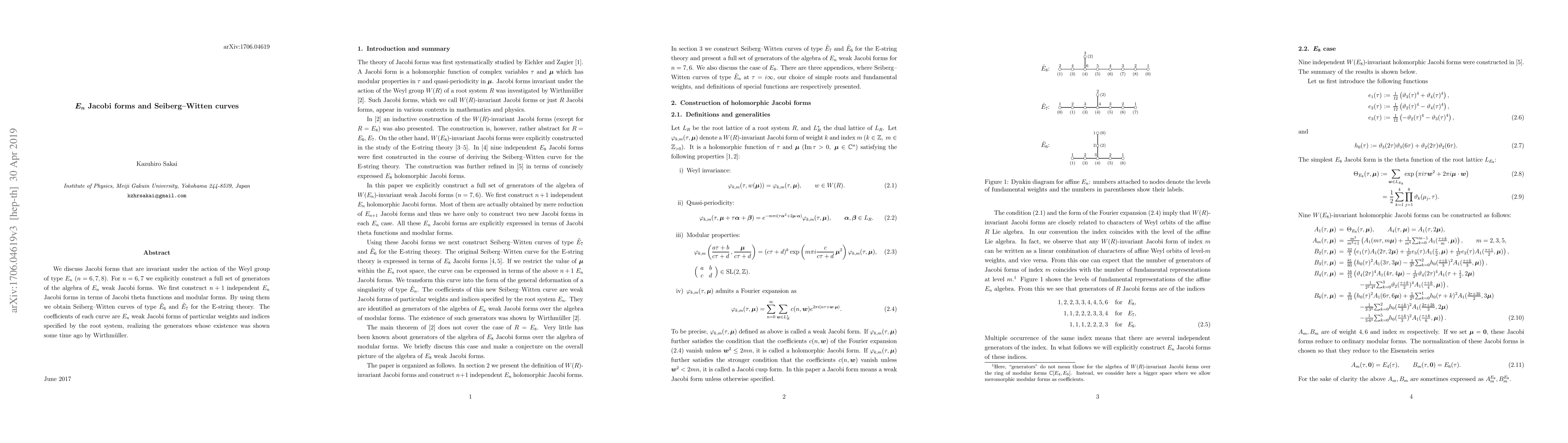 This paper constructs E_n Jacobi forms invariant under the Weyl group action for n=6,7,8, providing a full set of generators for n=6,7. It uses these forms to derive Seiberg-Witten curves for E_6 and E_7, linking Jacobi theta functions, modular forms, and E-string theory.