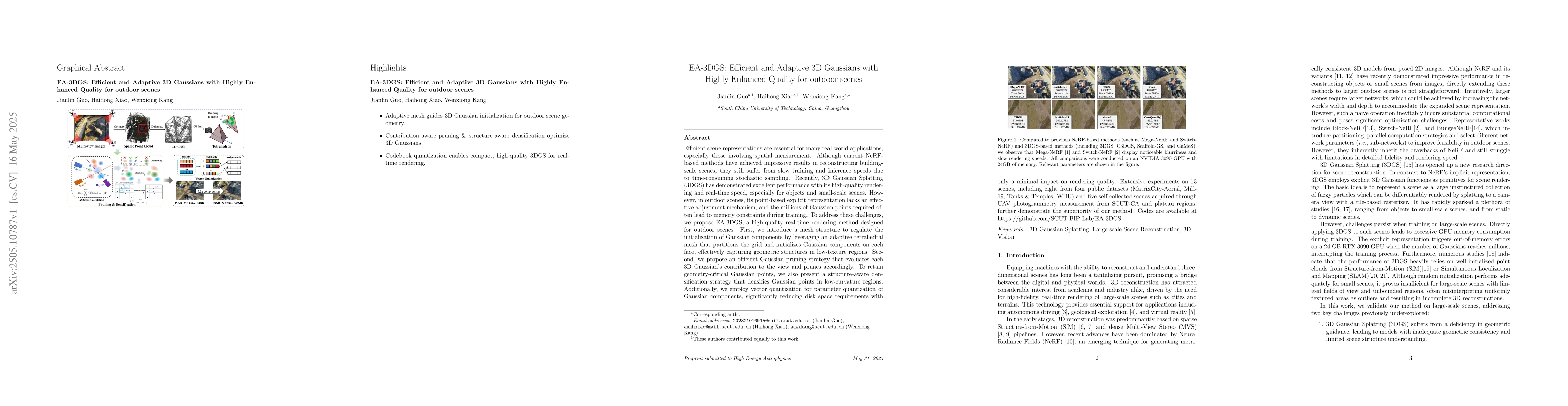 EA-3DGS presents an efficient and adaptive 3D Gaussian representation method for high-quality, real-time rendering of outdoor scenes, incorporating a mesh-based initialization, pruning, densification strategies, and vector quantization for parameter compression.