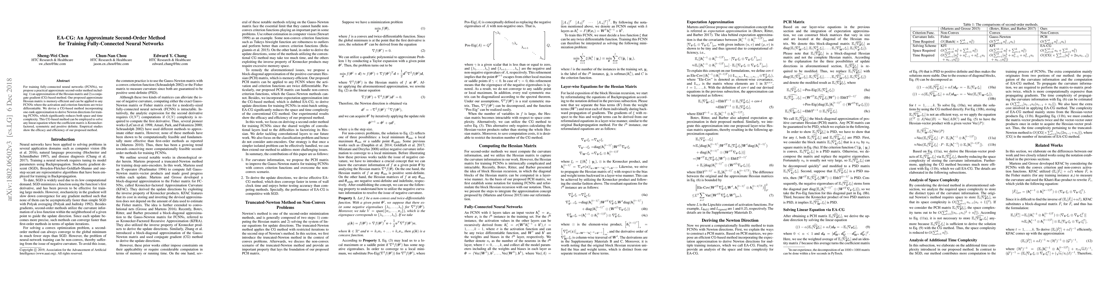 The paper proposes EA-CG, an efficient approximate second-order method for training fully-connected neural networks by approximating the Hessian matrix and using a conjugate gradient approach. This method reduces memory and computational complexity while maintaining effectiveness, as demonstrated by empirical studies.