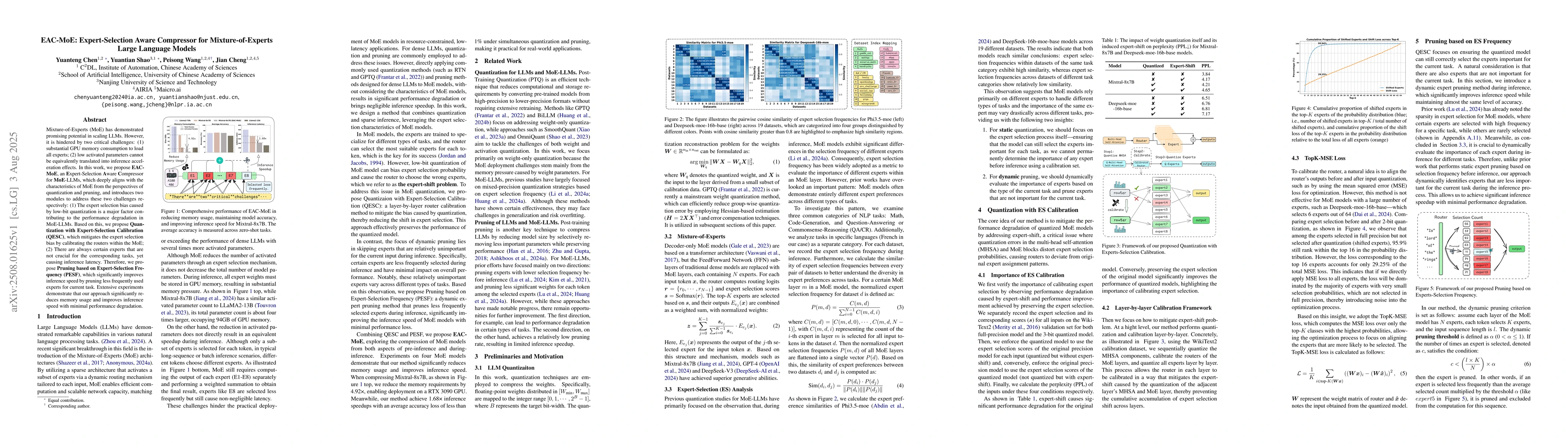 Mixture-of-Experts (MoE) has demonstrated promising potential in scaling LLMs. However, it is hindered by two critical challenges: (1) substantial GPU memory consumption to load all experts; (2) low activated parameters cannot be equivalently translated into inference acceleration effects. In this work, we propose EAC-MoE, an Expert-Selection Aware Compressor for MoE-LLMs, which deeply aligns with the characteristics of MoE from the perspectives of quantization and pruning, and introduces two modules to address these two challenges respectively: (1) The expert selection bias caused by low-bit quantization is a major factor contributing to the performance degradation in MoE-LLMs. Based on this, we propose Quantization with Expert-Selection Calibration (QESC), which mitigates the expert selection bias by calibrating the routers within the MoE; (2) There are always certain experts that are not crucial for the corresponding tasks, yet causing inference latency. Therefore, we propose Pruning based on Expert-Selection Frequency (PESF), which significantly improves inference speed by pruning less frequently used experts for current task. Extensive experiments demonstrate that our approach significantly reduces memory usage and improves inference speed with minimal performance degradation.