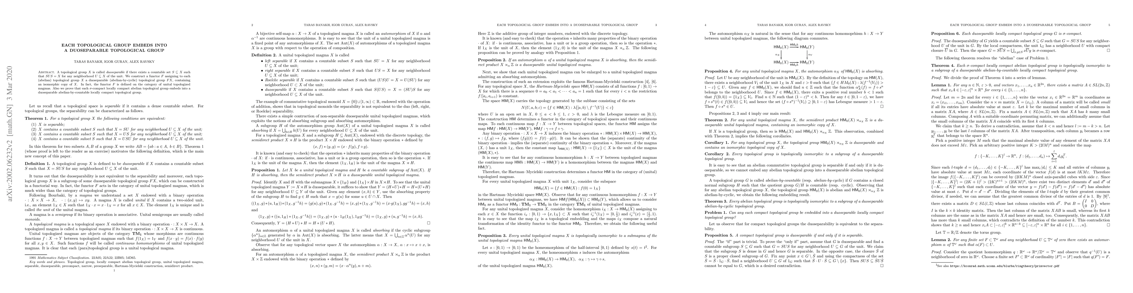 A topological group $X$ is called $duoseparable$ if there exists a countable set $S\subseteq X$ such that $SUS=X$ for any neighborhood $U\subseteq X$ of the unit. We construct a functor $F$ assigning to each (abelian) topological group $X$ a duoseparable (abelain-by-cyclic) topological group $FX$, containing an isomorphic copy of $X$. In fact, the functor $F$ is defined on the category of unital topologized magmas. Also we prove that each $\sigma$-compact locally compact abelian topological group embeds into a duoseparable locally compact abelian-by-countable topological group.