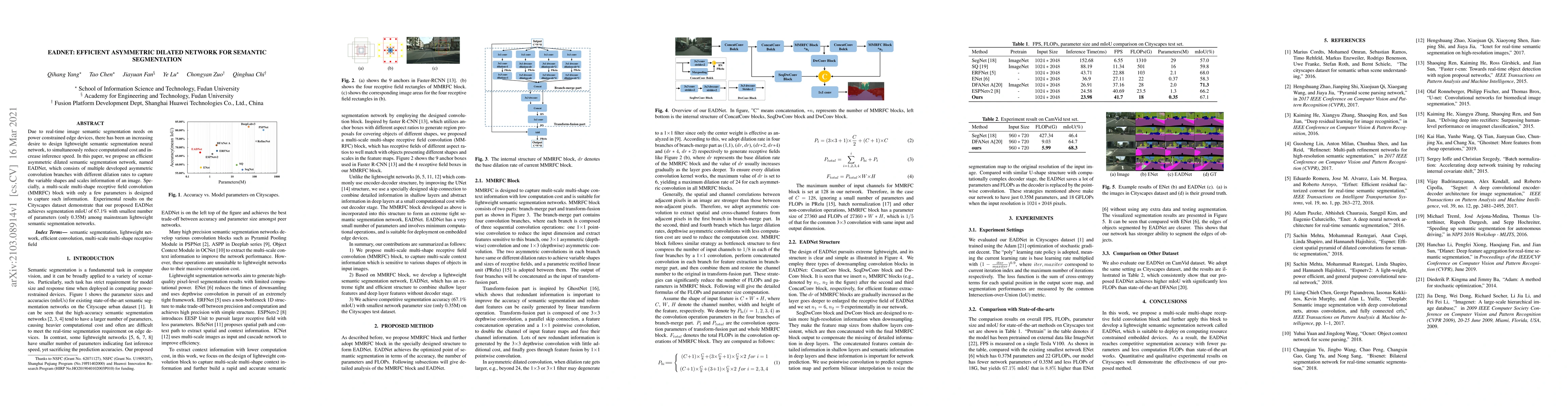 EADNet is an efficient asymmetric dilated network designed for real-time semantic segmentation on power-constrained edge devices. It employs multiple convolution branches with different dilation rates and a multi-scale multi-shape receptive field convolution block to capture diverse image information, achieving a high segmentation mIoU of 67.1 with minimal parameters (0.35M).