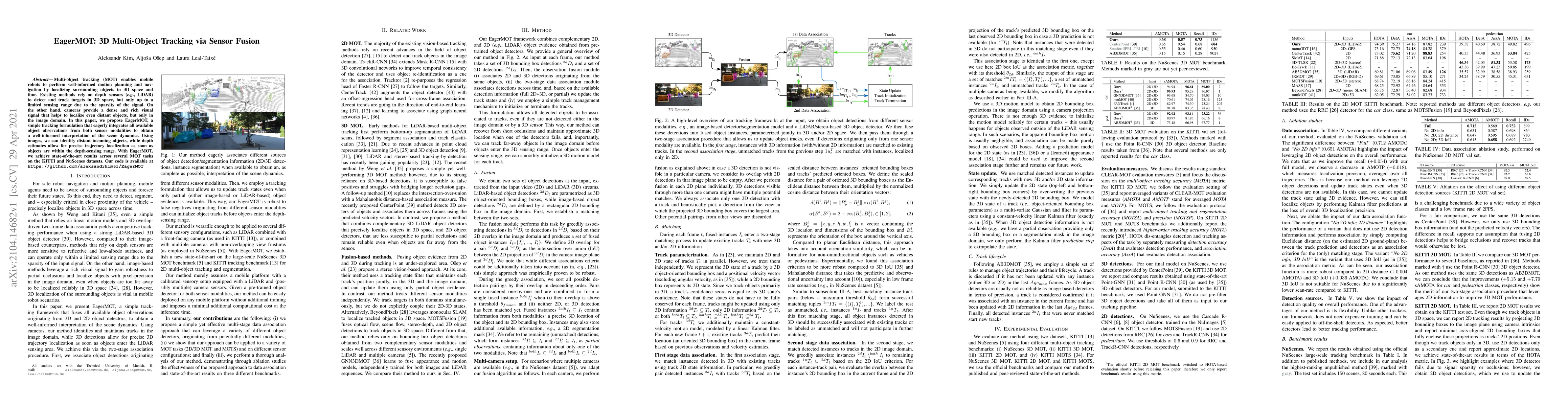 The paper introduces EagerMOT, a novel 3D multi-object tracking method that combines depth sensor and camera data to overcome individual modality limitations. EagerMOT achieves state-of-the-art results in MOT tasks on KITTI and NuScenes datasets, enabling precise localization of both near and distant objects.