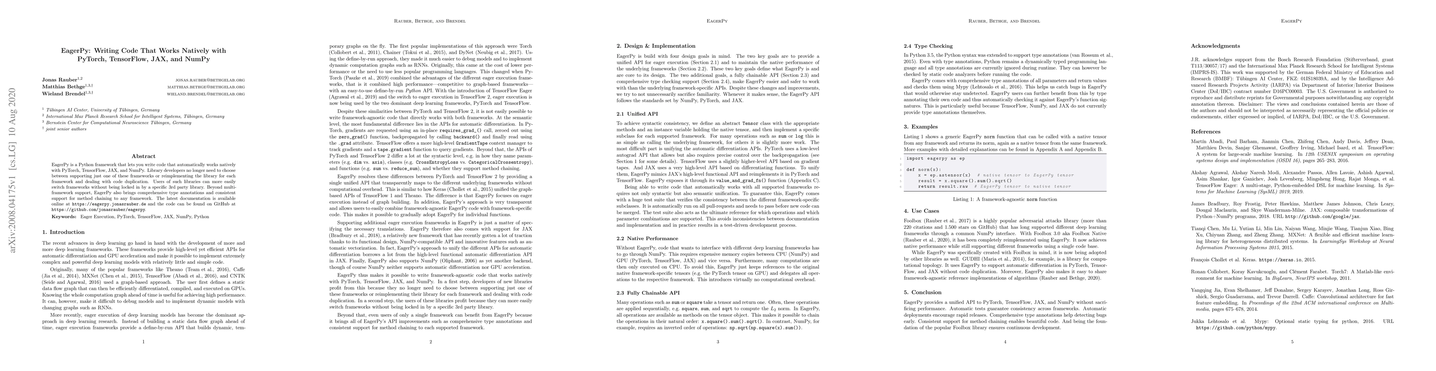 EagerPy is a Python framework that lets you write code that automatically works natively with PyTorch, TensorFlow, JAX, and NumPy. Library developers no longer need to choose between supporting just one of these frameworks or reimplementing the library for each framework and dealing with code duplication. Users of such libraries can more easily switch frameworks without being locked in by a specific 3rd party library. Beyond multi-framework support, EagerPy also brings comprehensive type annotations and consistent support for method chaining to any framework. The latest documentation is available online at https://eagerpy.jonasrauber.de and the code can be found on GitHub at https://github.com/jonasrauber/eagerpy.