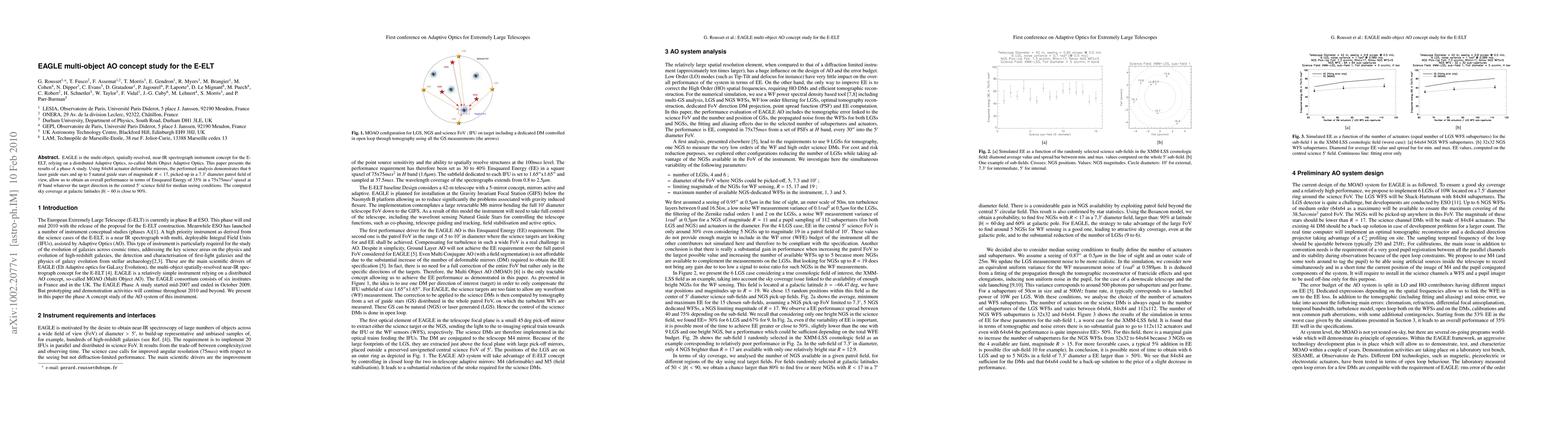 EAGLE is the multi-object, spatially-resolved, near-IR spectrograph instrument concept for the E-ELT, relying on a distributed Adaptive Optics, so-called Multi Object Adaptive Optics. This paper presents the results of a phase A study. Using 84x84 actuator deformable mirrors, the performed analysis demonstrates that 6 laser guide stars and up to 5 natural guide stars of magnitude R<17, picked-up in a 7.3' diameter patrol field of view, allow us to obtain an overall performance in terms of Ensquared Energy of 35% in a 75x75 mas^2 spaxel at H band, whatever the target direction in the centred 5' science field for median seeing conditions. The computed sky coverage at galactic latitudes |b|~60 is close to 90%.