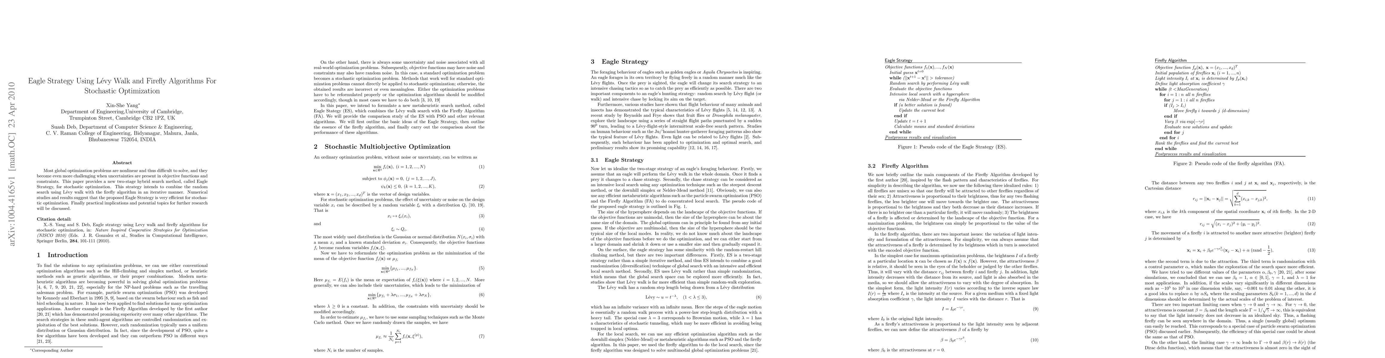 This paper introduces a new hybrid search method called Eagle Strategy that combines Lévy walk with the firefly algorithm to solve stochastic optimization problems, demonstrating its efficiency in numerical studies.