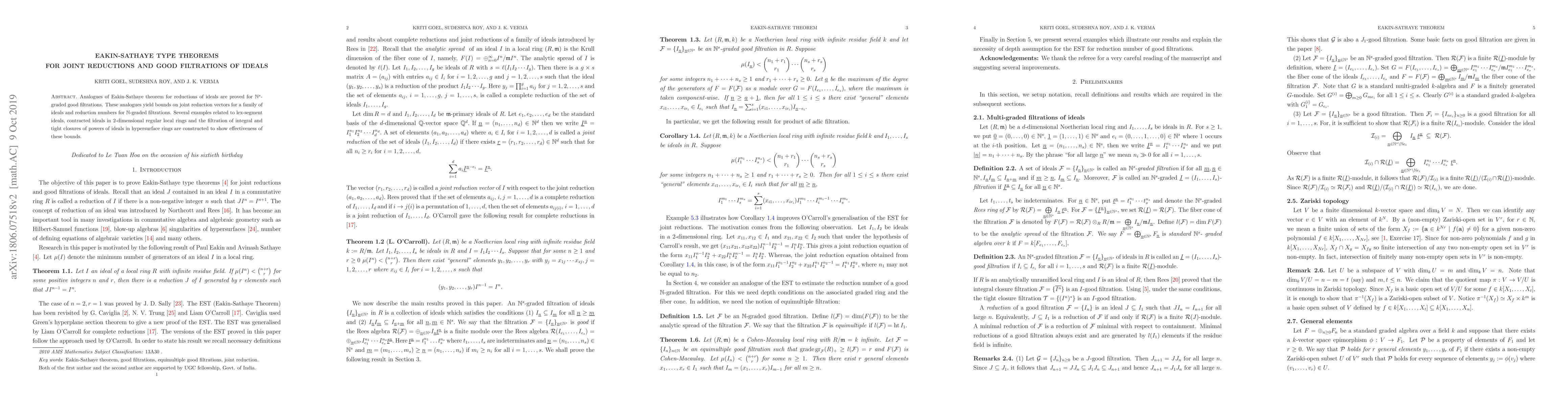 This paper proves Eakin-Sathaye type theorems for ${\mathbb N}^s$-graded good filtrations, providing bounds on joint reduction vectors for ideal families and reduction numbers for $\mathbb N$-graded filtrations. Examples involving lex-segment ideals and contracted ideals in regular local rings illustrate the practical effectiveness of these bounds.