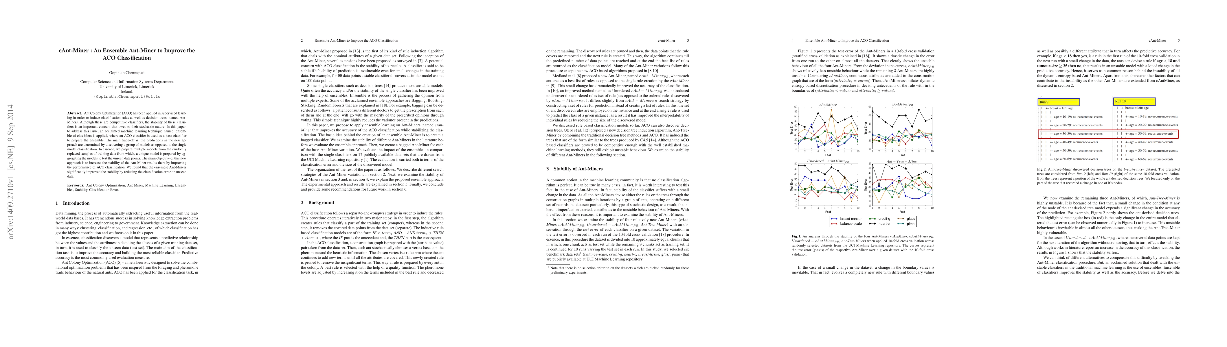 The paper proposes an ensemble approach called eAnt-Miner to enhance the stability of Ant-Miner classifiers based on Ant Colony Optimization. By generating multiple models from randomly sampled training data and aggregating their predictions, the ensemble method significantly improves classification performance and reduces error on unseen data.