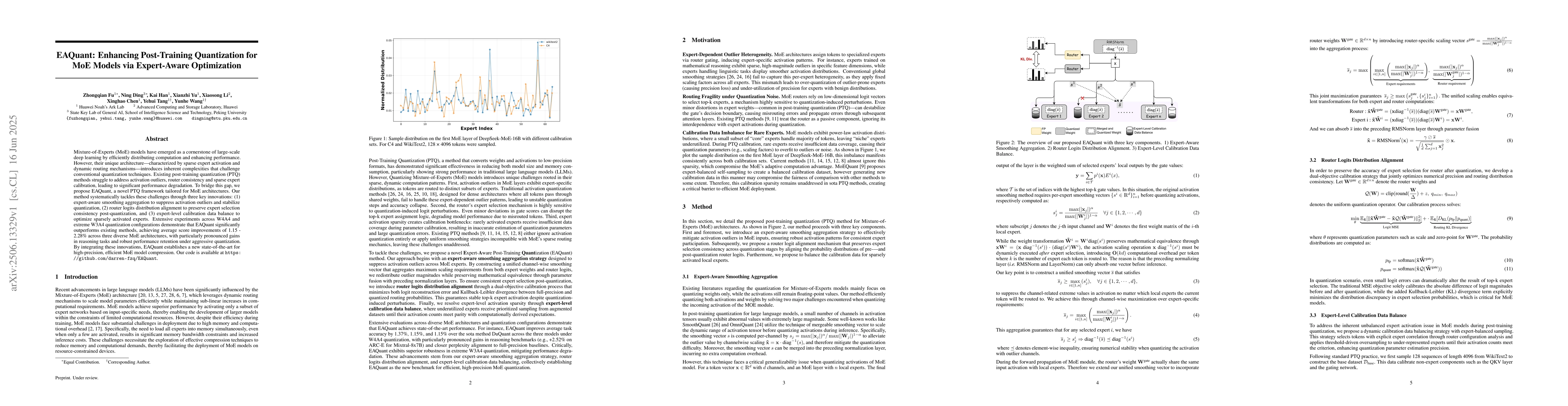 The paper proposes EAQuant, a post-training quantization (PTQ) framework specifically designed for MoE models. It tackles challenges in MoE quantization through expert-aware smoothing aggregation, router logits distribution alignment, and expert-level calibration data balance.