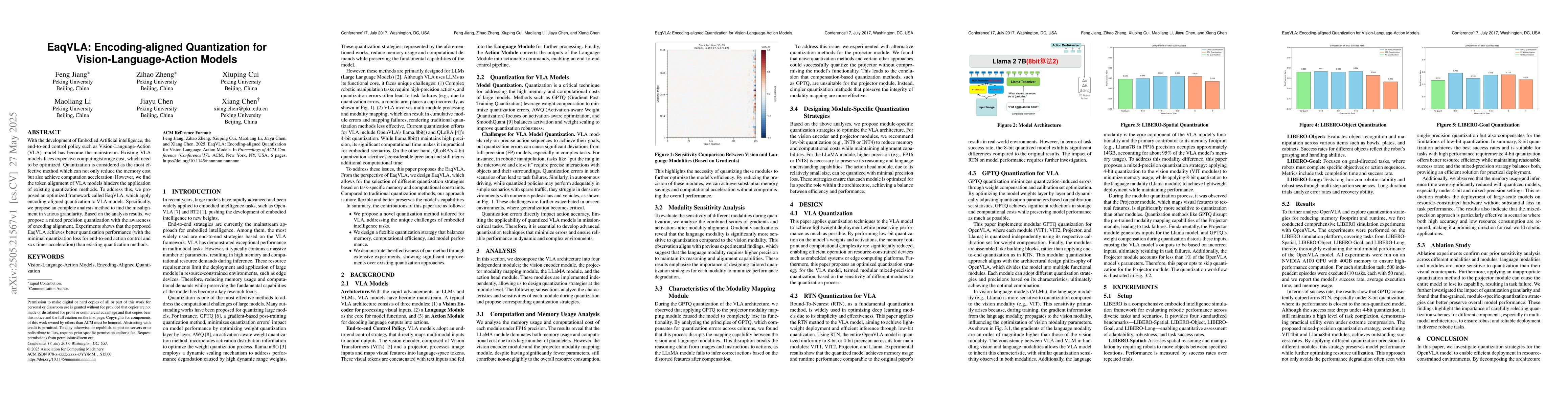 EaqVLA reduces memory costs and accelerates computation in Vision-Language-Action models through encoding-aligned quantization, achieving better performance than existing methods.
