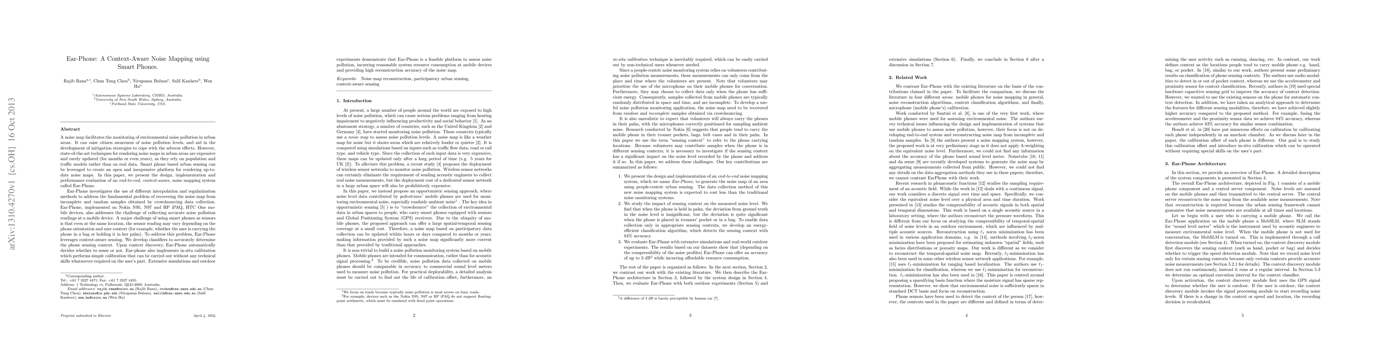 Ear-Phone is a context-aware noise mapping system leveraging smart phones to create up-to-date, open noise maps for urban areas. It addresses the challenges of incomplete data and varying sensor readings due to phone orientation and user context through context-aware sensing and in-situ calibration.