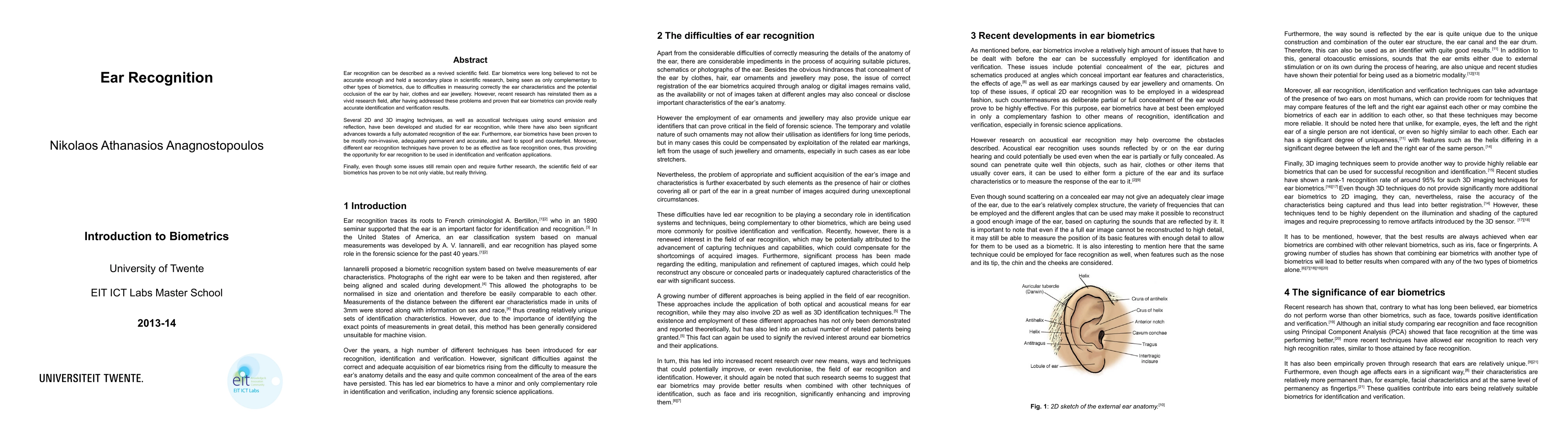 This research paper discusses the resurgence of ear recognition as a reliable biometric method, highlighting advancements in 2D and 3D imaging, and acoustical techniques that have improved accuracy and automation. It concludes that ear biometrics are non-invasive, permanent, and difficult to spoof, making them competitive with face recognition for identification and verification applications.