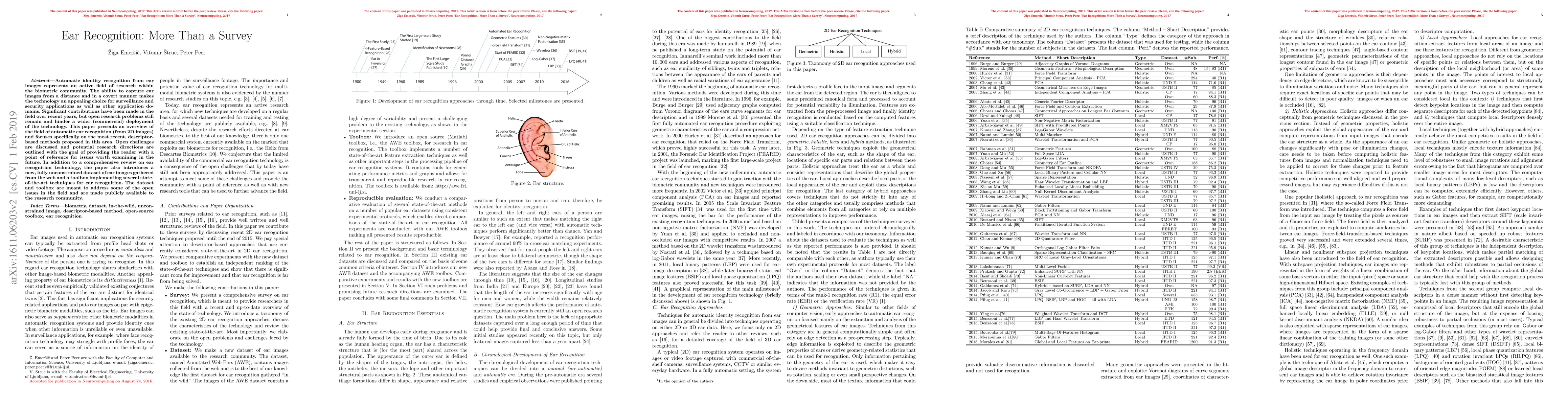 This paper reviews recent advancements in automatic ear recognition technology, focusing on descriptor-based methods, and discusses remaining challenges and future research directions. It also introduces a new dataset and toolbox to facilitate further research and address open issues in the field.