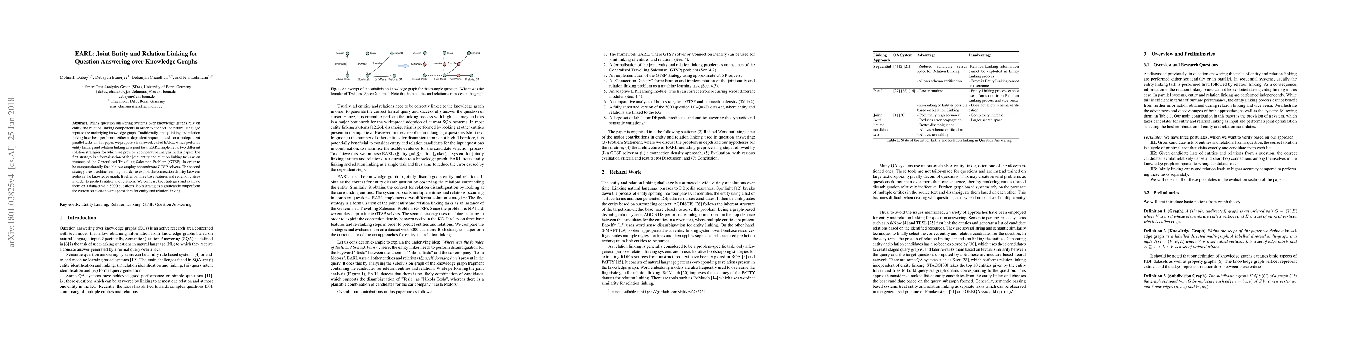 This paper introduces EARL, a framework for joint entity and relation linking in question answering systems over knowledge graphs. It proposes two strategies: one using approximate GTSP solvers and another leveraging machine learning to predict connections based on graph density, both outperforming existing methods.