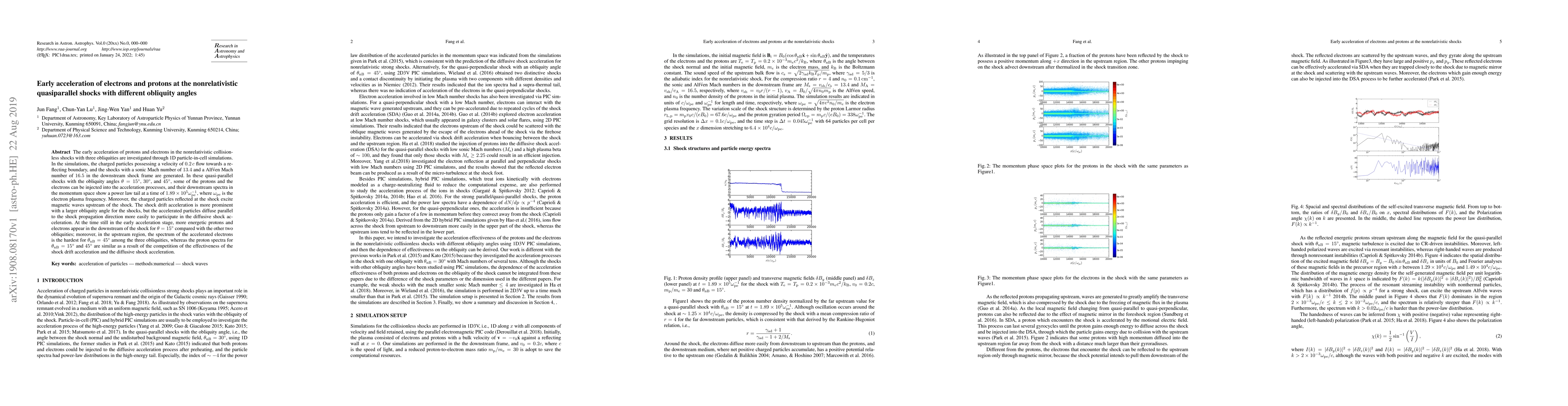 The early acceleration of protons and electrons in the nonrelativistic collisionless shocks with three obliquities are investigated through 1D particle-in-cell simulations. In the simulations, the charged particles possessing a velocity of $0.2\, c$ flow towards a reflecting boundary, and the shocks with a sonic Mach number of $13.4$ and a Alf\'{v}en Mach number of $16.5$ in the downstream shock frame are generated. In these quasi-parallel shocks with the obliquity angles $\theta = 15^\circ$, $30^\circ$, and $45^\circ$, some of the protons and the electrons can be injected into the acceleration processes, and their downstream spectra in the momentum space show a power law tail at a time of $1.89\times10^5 \omega_{\rm pe}^{-1}$, where $\omega_{\rm pe}$ is the electron plasma frequency. Moreover, the charged particles reflected at the shock excite magnetic waves upstream of the shock. The shock drift acceleration is more prominent with a larger obliquity angle for the shocks, but the accelerated particles diffuse parallel to the shock propagation direction more easily to participate in the diffusive shock acceleration. At the time still in the early acceleration stage, more energetic protons and electrons appear in the downstream of the shock for $\theta = 15^\circ$ compared with the other two obliquities; moreover, in the upstream region, the spectrum of the accelerated electrons is the hardest for $\theta_{\rm nB} = 45^\circ$ among the three obliquities, whereas the proton spectra for $\theta_{\rm nB} = 15^\circ$ and $45^\circ$ are similar as a result of the competition of the effectiveness of the shock drift acceleration and the diffusive shock acceleration.