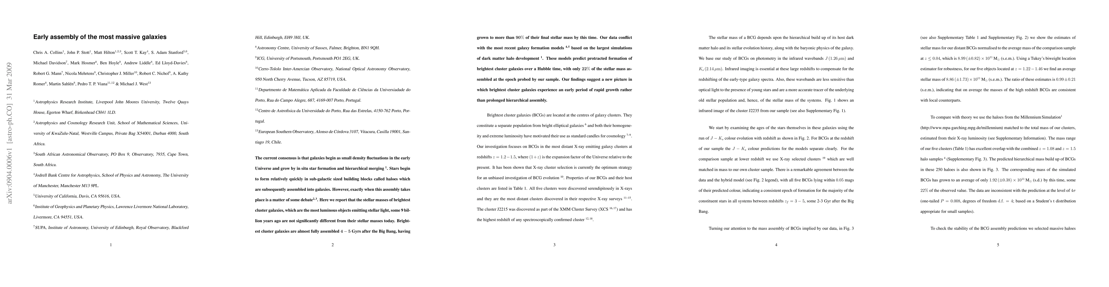 Brightest cluster galaxies, the most massive galaxies in the universe, formed 90% of their current mass just 4-5 billion years after the Big Bang, contradicting current galaxy formation models.