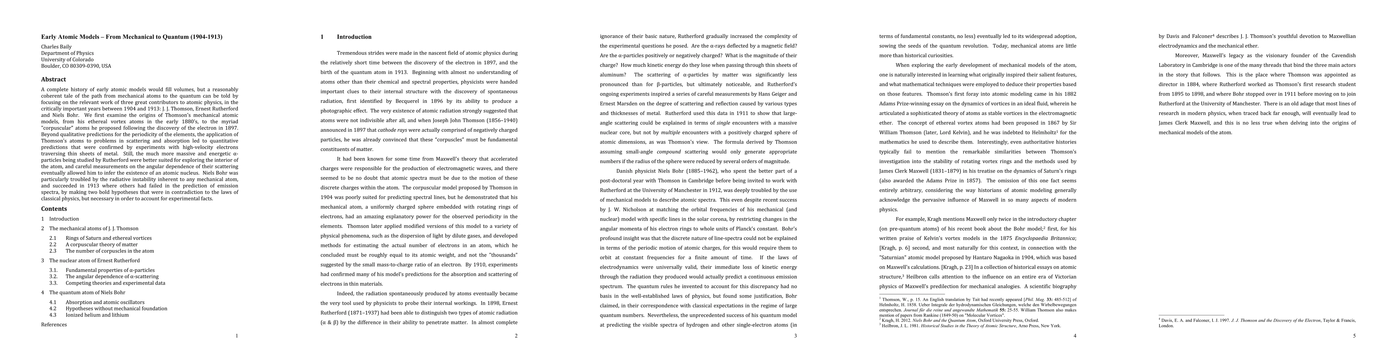 A complete history of early atomic models would fill volumes, but a reasonably coherent tale of the path from mechanical atoms to the quantum can be told by focusing on the relevant work of three great contributors to atomic physics, in the critically important years between 1904 and 1913: J. J. Thomson, Ernest Rutherford and Niels Bohr. We first examine the origins of Thomson's mechanical atomic models, from his ethereal vortex atoms in the early 1880's, to the myriad "corpuscular" atoms he proposed following the discovery of the electron in 1897. Beyond predictions for the periodicity of the elements, the application of Thomson's atoms to problems in scattering and absorption led to quantitative predictions that were confirmed by experiments with high-velocity electrons traversing thin sheets of metal. Still, the much more massive and energetic {\alpha}-particles being studied by Rutherford were better suited for exploring the interior of the atom, and careful measurements on the angular dependence of their scattering eventually allowed him to infer the existence of an atomic nucleus. Niels Bohr was particularly troubled by the radiative instability inherent to any mechanical atom, and succeeded in 1913 where others had failed in the prediction of emission spectra, by making two bold hypotheses that were in contradiction to the laws of classical physics, but necessary in order to account for experimental facts.