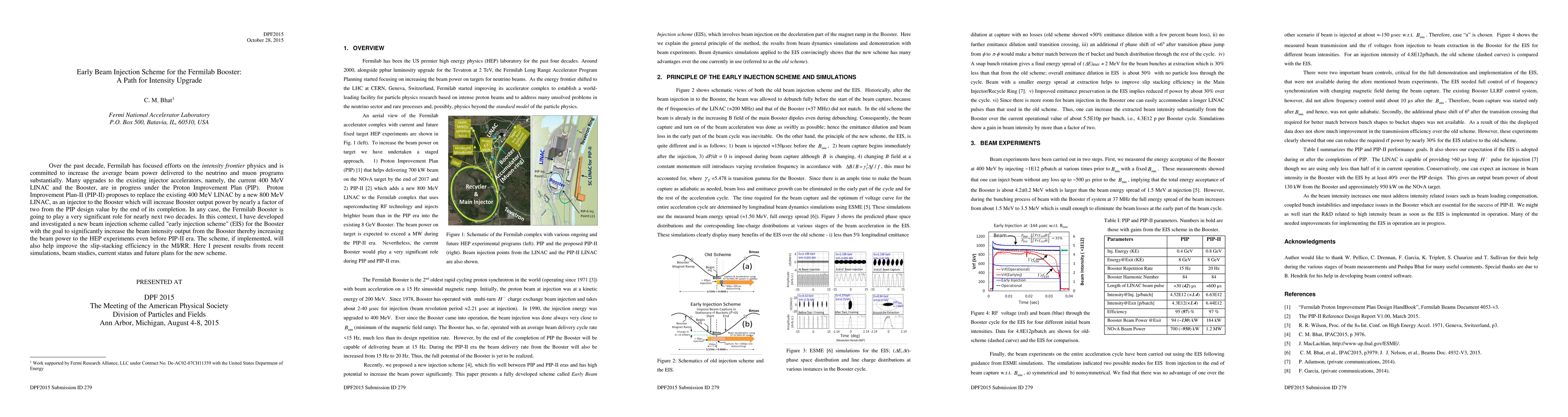 Over the past decade, Fermilab has focused efforts on the intensity frontier physics and is committed to increase the average beam power delivered to the neutrino and muon programs substantially. Many upgrades to the existing injector accelerators, namely, the current 400 MeV LINAC and the Booster, are in progress under the Proton Improvement Plan (PIP). Proton Improvement Plan-II (PIP-II) proposes to replace the existing 400 MeV LINAC by a new 800 MeV LINAC, as an injector to the Booster which will increase Booster output power by nearly a factor of two from the PIP design value by the end of its completion. In any case, the Fermilab Booster is going to play a very significant role for nearly next two decades. In this context, I have developed and investigated a new beam injection scheme called "early injection scheme" (EIS) for the Booster with the goal to significantly increase the beam intensity output from the Booster thereby increasing the beam power to the HEP experiments even before PIP-II era. The scheme, if implemented, will also help improve the slip-stacking efficiency in the MI/RR. Here I present results from recent simulations, beam studies, current status and future plans for the new scheme.