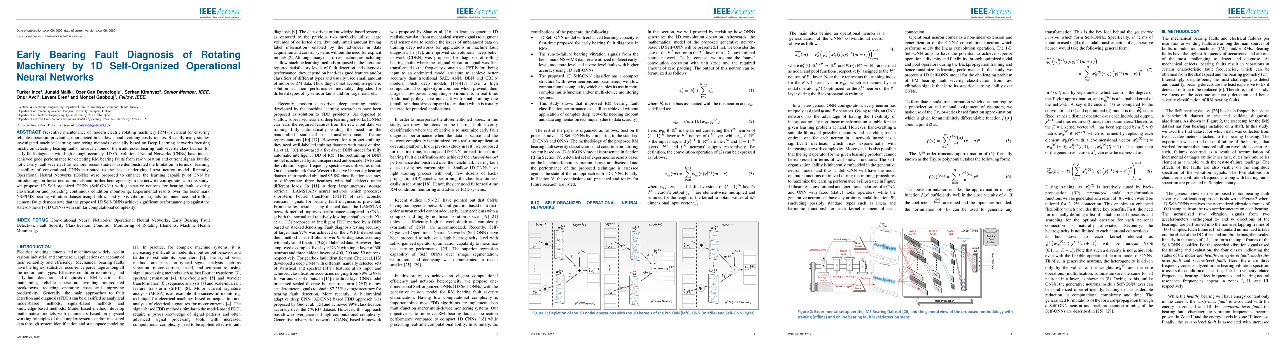 This paper proposes 1D Self-Organized Operational Neural Networks (Self-ONNs) for early bearing fault diagnosis and severity classification in rotating machinery, achieving superior performance compared to 1D Convolutional Neural Networks (CNNs) while maintaining similar computational complexity. The Self-ONNs utilize generative neurons to enhance learning capability and provide continuous condition monitoring.