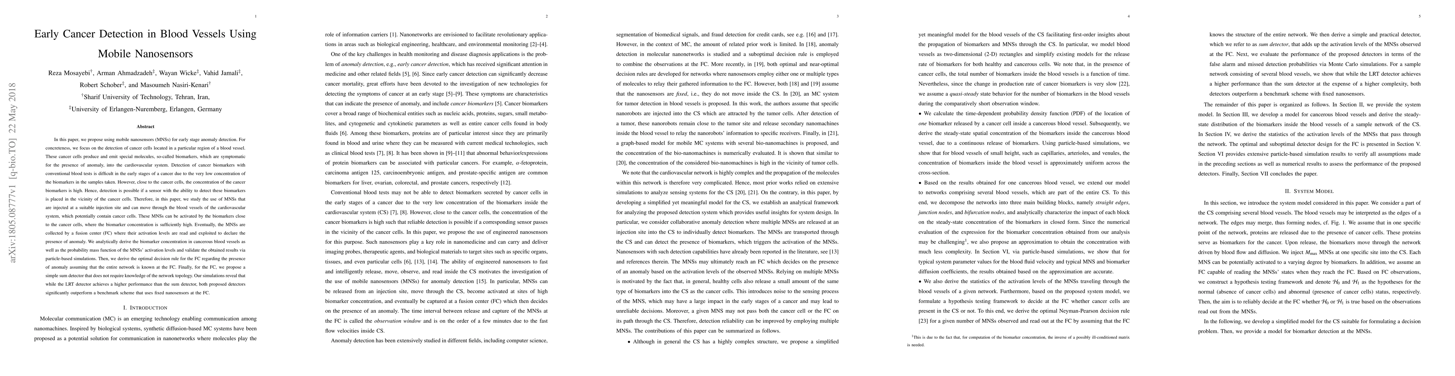 This paper proposes using mobile nanosensors (MNSs) for early cancer detection by detecting biomarkers in blood vessels. The MNSs, injected into the cardiovascular system, move through blood vessels to locate high biomarker concentrations near cancer cells, and are then collected by a fusion center for analysis. The study analytically derives the biomarker concentration and proposes optimal and simpler detection rules, showing significant improvement over fixed nanosensors.