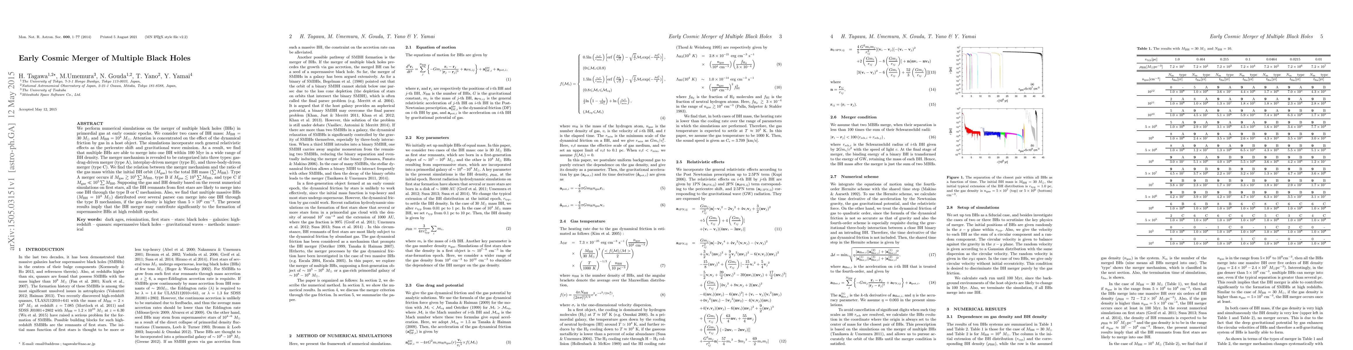 We perform numerical simulations on the merger of multiple black holes (BHs) in primordial gas at early cosmic epochs. We consider two cases of BH mass: $M_{BH} = 30 M_{\odot}$ and $M_{BH} = 10^4 M_{\odot}$. Attention is concentrated on the effect of the dynamical friction by gas in a host object. The simulations incorporate such general relativistic effects as the pericentre shift and gravitational wave emission. As a result, we find that multiple BHs are able to merge into one BH within 100 Myr in a wide range of BH density. The merger mechanism is revealed to be categorized into three types: gas-drag-driven merger (type A), interplay-driven merger (type B), and three-body-driven merger (type C). We find the relation between the merger mechanism and the ratio of the gas mass within the initial BH orbit ($M_{gas}$) to the total BH mass (${\Sigma}M_{BH}$). Type A merger occurs if $M_{gas} \gtrsim 10^5 {\Sigma}M_{BH}$, type B if $M_{gas} \lesssim 10^5 {\Sigma}M_{BH}$, and type C if $M_{gas} \ll 10^5 {\Sigma}M_{BH}$. Supposing the gas and BH density based on the recent numerical simulations on first stars, all the BH remnants from first stars are likely to merge into one BH through the type B or C mechanism. Also, we find that multiple massive BHs ($M_{BH} = 10^4 M_{\odot}$) distributed over several parsec can merge into one BH through the type B mechanism, if the gas density is higher than $5\times 10^6$ cm$^{-3}$. The present results imply that the BH merger may contribute significantly to the formation of supermassive BHs at high redshift epochs.