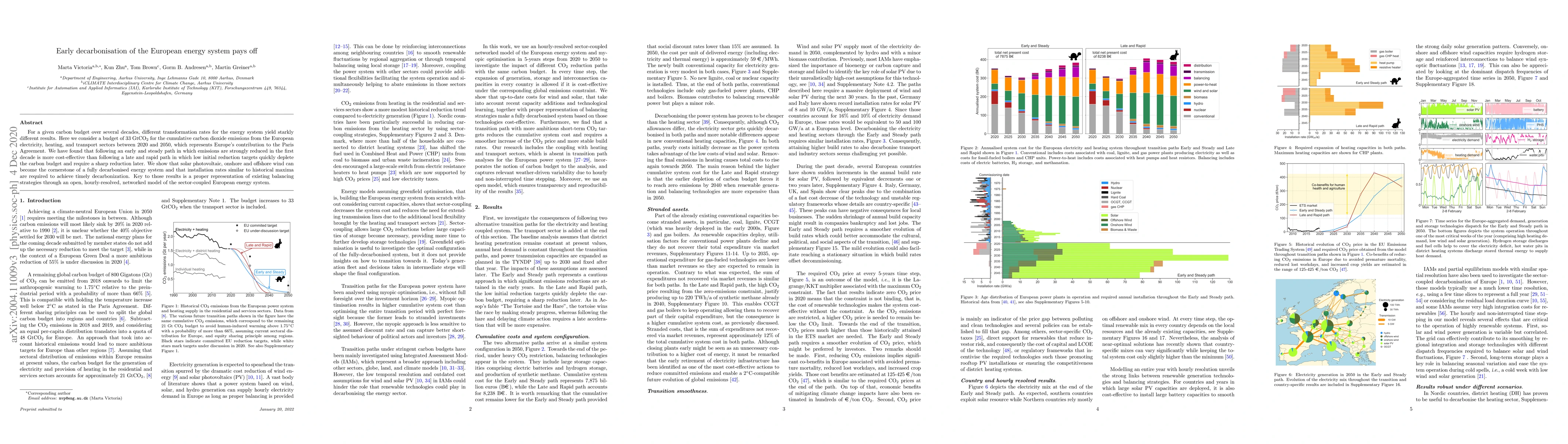This study finds that an early and steady reduction in carbon emissions in the European energy system is more cost-effective than a late and rapid reduction approach. Solar, wind, and other renewable technologies are identified as crucial for achieving timely decarbonisation.