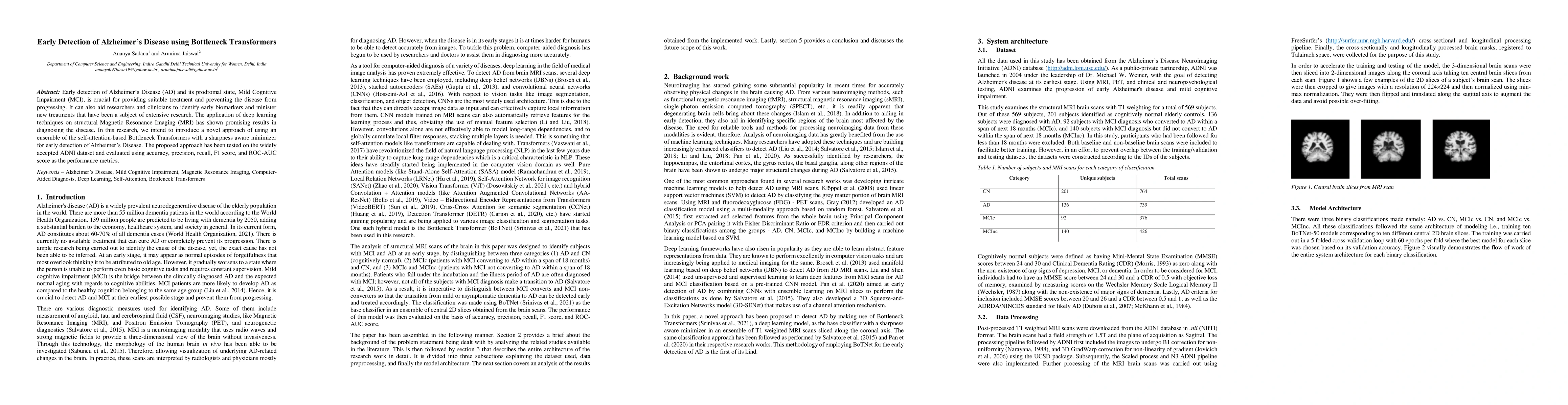 Early detection of Alzheimer's Disease (AD) and its prodromal state, Mild Cognitive Impairment (MCI), is crucial for providing suitable treatment and preventing the disease from progressing. It can also aid researchers and clinicians to identify early biomarkers and minister new treatments that have been a subject of extensive research. The application of deep learning techniques on structural Magnetic Resonance Imaging (MRI) has shown promising results in diagnosing the disease. In this research, we intend to introduce a novel approach of using an ensemble of the self-attention-based Bottleneck Transformers with a sharpness aware minimizer for early detection of Alzheimer's Disease. The proposed approach has been tested on the widely accepted ADNI dataset and evaluated using accuracy, precision, recall, F1 score, and ROC-AUC score as the performance metrics.