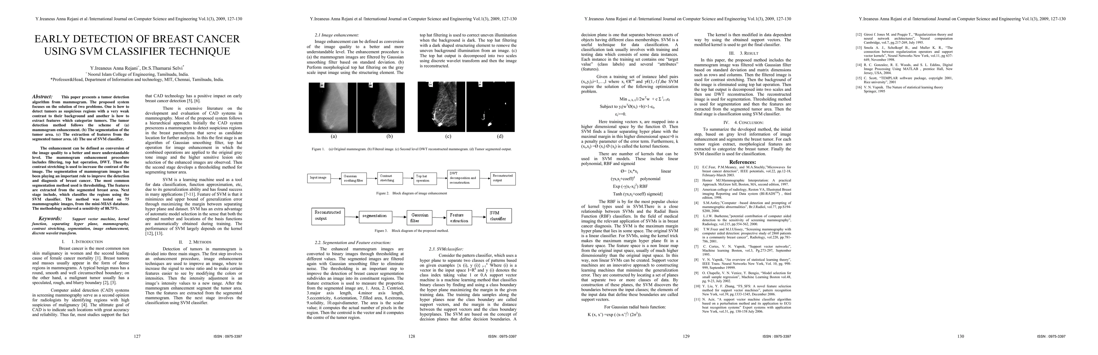 This research proposes an SVM classifier-based algorithm for early breast cancer detection in mammograms, involving image enhancement, tumor segmentation, feature extraction, and classification, achieving 88.75% sensitivity on 75 images from the mini-MIAS database.