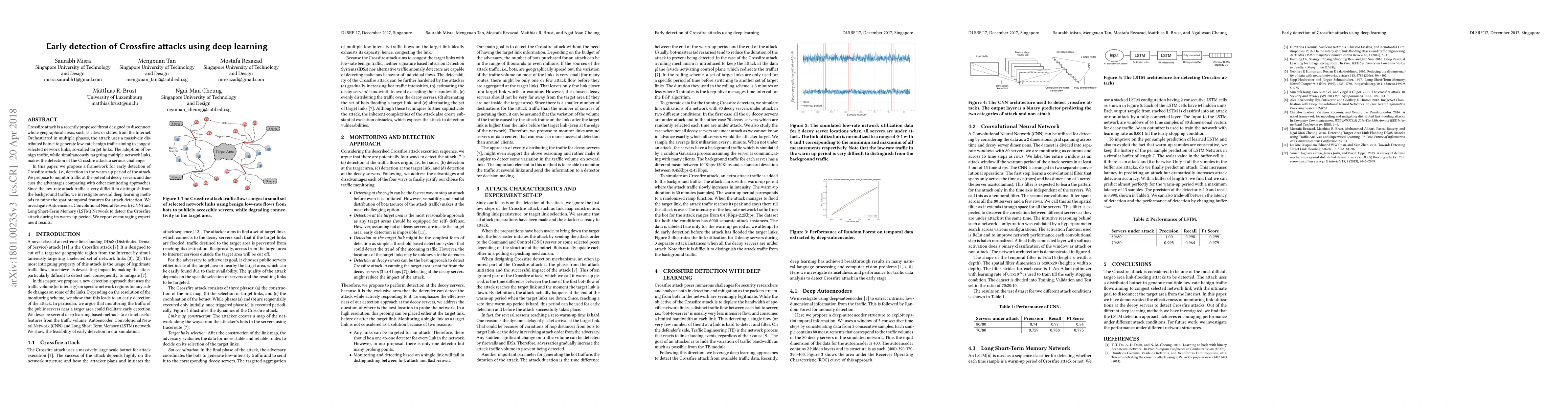 This paper proposes a deep learning framework for early detection of Crossfire attacks, which aim to disconnect geographical areas from the Internet by congesting network links. The authors explore Autoencoder, CNN, and LSTM networks to identify low-rate attack traffic, achieving promising results in detecting the attack during its initial phase.