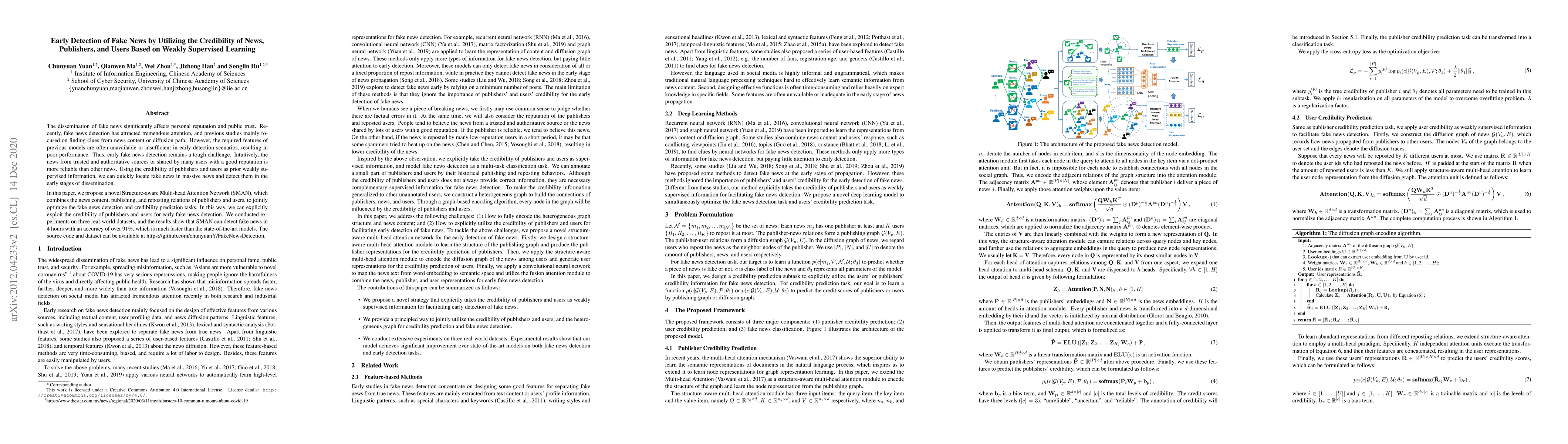 This paper proposes a Structure-aware Multi-head Attention Network (SMAN) to enhance early detection of fake news by leveraging the credibility of news publishers and users as weakly supervised information. Experiments demonstrate SMAN's ability to identify fake news within four hours with over 91% accuracy, outperforming existing models.