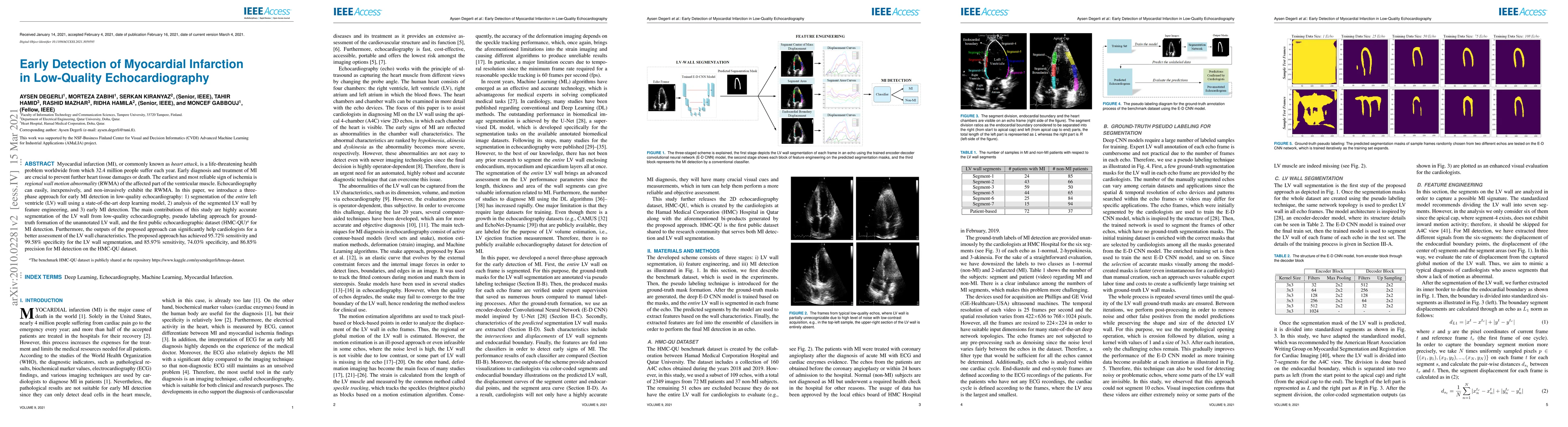 This paper proposes a three-phase deep learning approach for early detection of myocardial infarction (MI) using low-quality echocardiography. The method includes LV wall segmentation, feature analysis, and MI detection, achieving high accuracy in LV wall segmentation and promising results for MI detection. The study also introduces a new public dataset for MI detection.