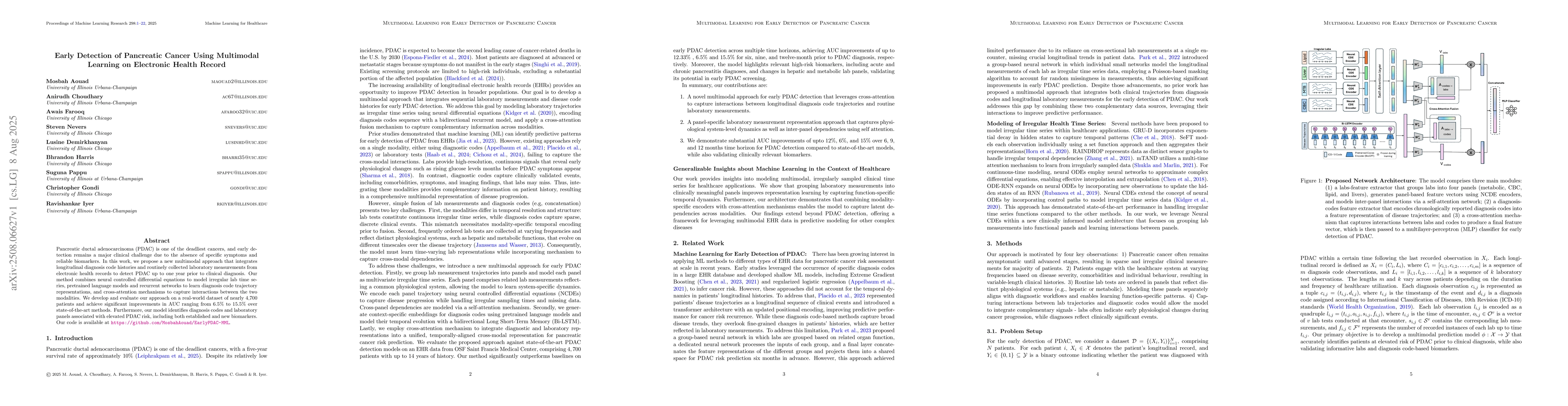 The research proposes a multimodal approach integrating longitudinal diagnosis code histories and routinely collected laboratory measurements from electronic health records to detect pancreatic ductal adenocarcinoma (PDAC) up to one year prior to clinical diagnosis. It combines neural controlled differential equations (NCDE) for modeling irregular lab time series, pretrained language models, recurrent networks for diagnosis code trajectory representations, and cross-attention mechanisms to capture interactions between modalities.