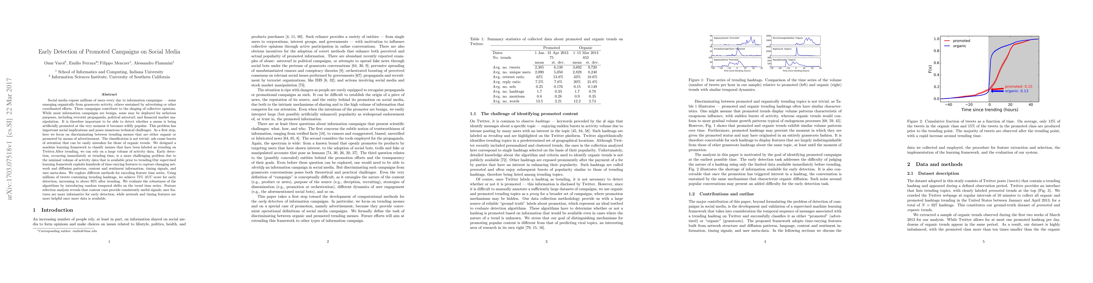 Researchers developed a machine learning framework to detect promoted social media campaigns, achieving 75% AUC score for early detection and 95% after trending, highlighting the importance of content cues and user features in early detection.