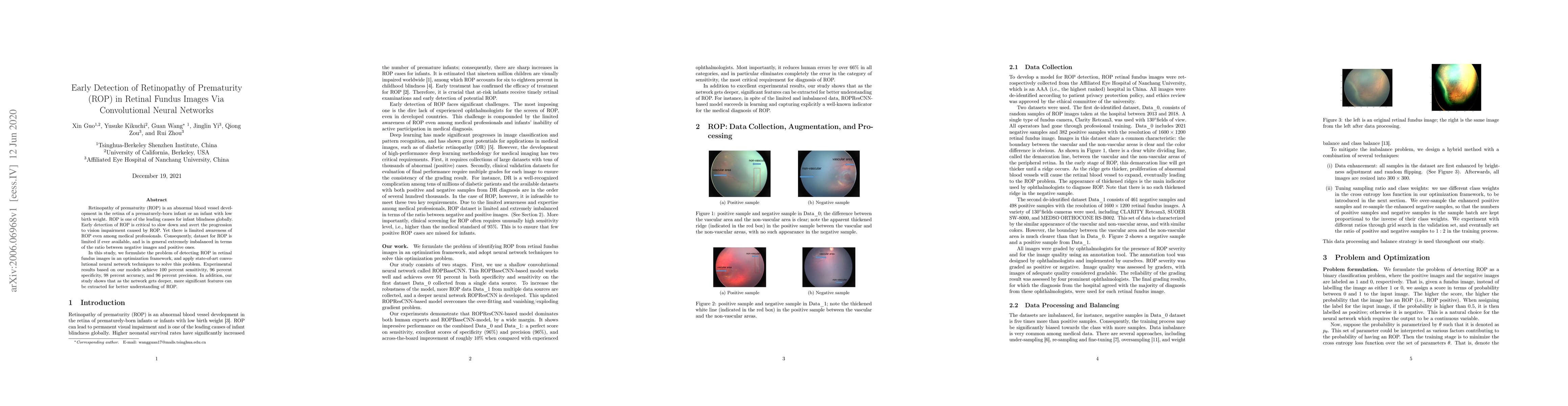 Retinopathy of prematurity (ROP) is an abnormal blood vessel development in the retina of a prematurely-born infant or an infant with low birth weight. ROP is one of the leading causes for infant blindness globally. Early detection of ROP is critical to slow down and avert the progression to vision impairment caused by ROP. Yet there is limited awareness of ROP even among medical professionals. Consequently, dataset for ROP is limited if ever available, and is in general extremely imbalanced in terms of the ratio between negative images and positive ones. In this study, we formulate the problem of detecting ROP in retinal fundus images in an optimization framework, and apply state-of-art convolutional neural network techniques to solve this problem. Experimental results based on our models achieve 100 percent sensitivity, 96 percent specificity, 98 percent accuracy, and 96 percent precision. In addition, our study shows that as the network gets deeper, more significant features can be extracted for better understanding of ROP.