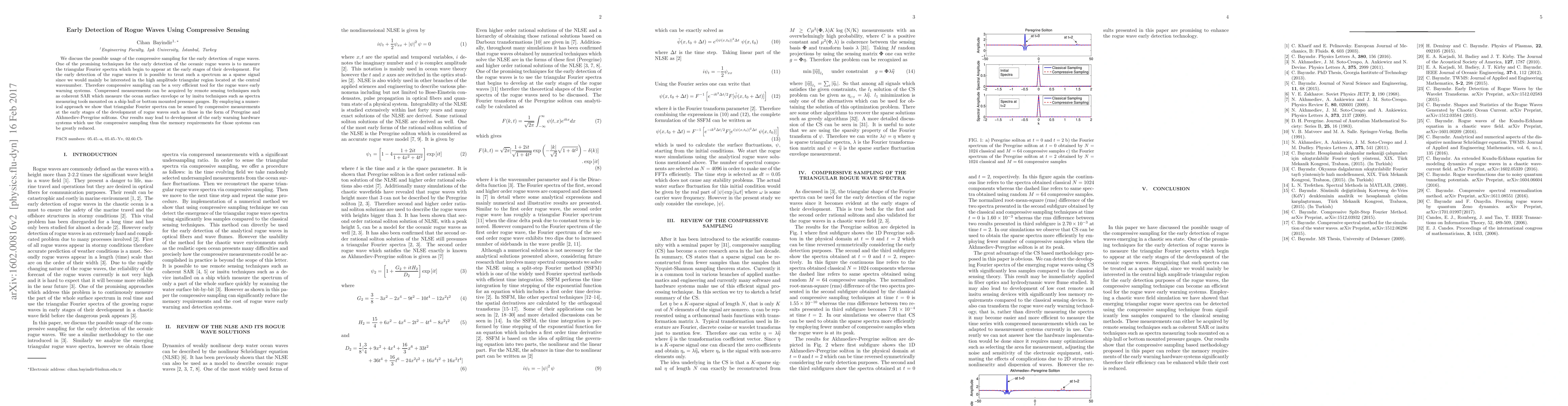 This paper explores the use of compressive sensing for early detection of rogue waves by analyzing their triangular Fourier spectra, which appear at the initial stages of development. Compressive sampling can efficiently identify these sparse signals, potentially leading to the development of low-memory, early warning systems for rogue waves.