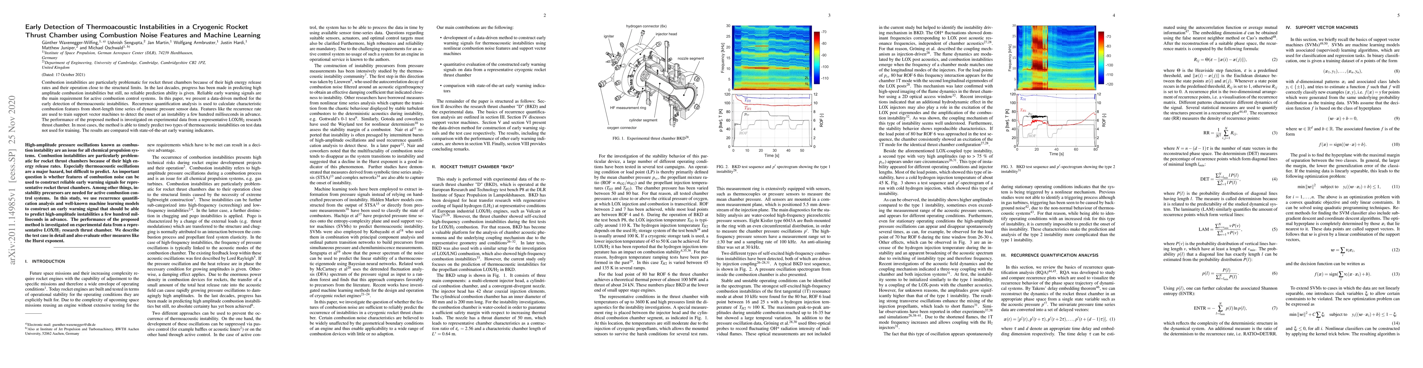 This paper proposes a machine learning method for early detection of thermoacoustic instabilities in cryogenic rocket thrust chambers using combustion noise features and recurrence quantification analysis. The trained support vector machines can predict instability onsets ahead of time, demonstrating effectiveness on experimental data.