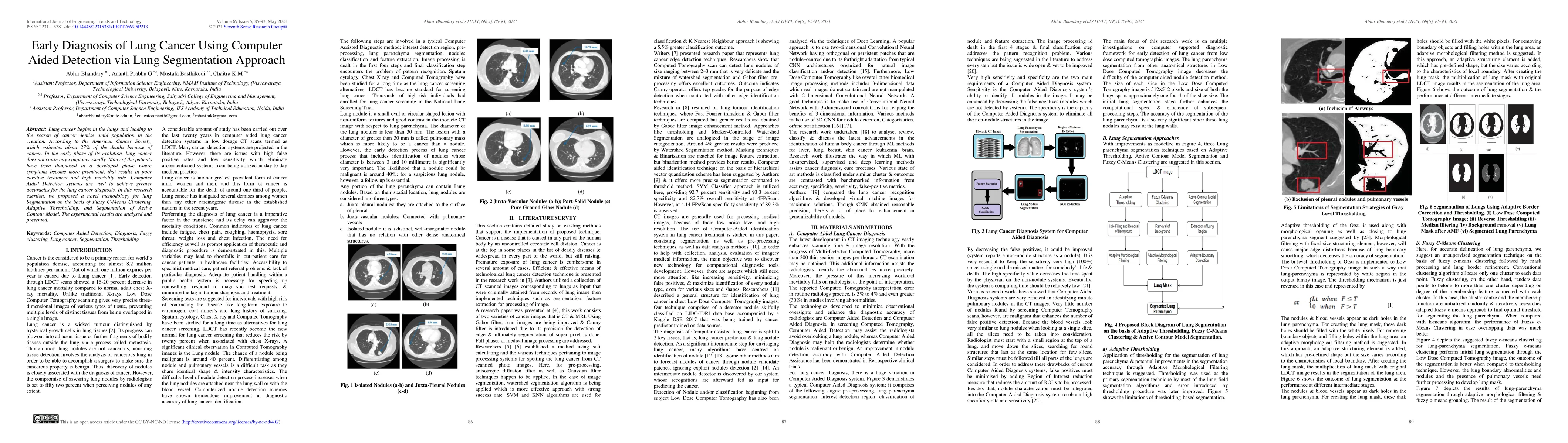 Lung cancer begins in the lungs and leading to the reason of cancer demise amid population in the creation. According to the American Cancer Society, which estimates about 27% of the deaths because of cancer. In the early phase of its evolution, lung cancer does not cause any symptoms usually. Many of the patients have been diagnosed in a developed phase where symptoms become more prominent, that results in poor curative treatment and high mortality rate. Computer Aided Detection systems are used to achieve greater accuracies for the lung cancer diagnosis. In this research exertion, we proposed a novel methodology for lung Segmentation on the basis of Fuzzy C-Means Clustering, Adaptive Thresholding, and Segmentation of Active Contour Model. The experimental results are analysed and presented.
