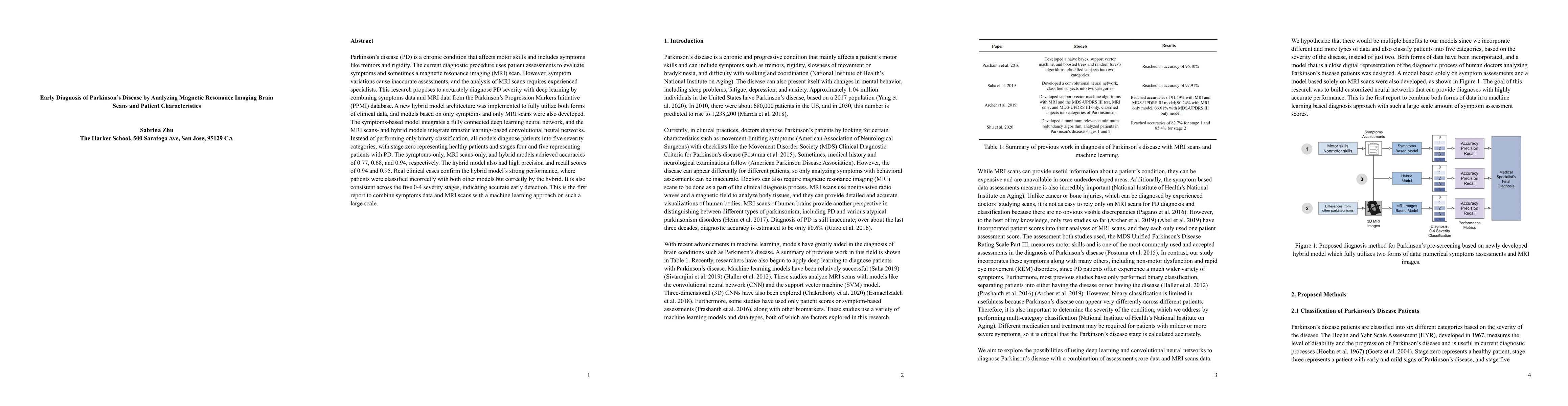 This research develops a hybrid deep learning model to diagnose Parkinson's disease severity by integrating patient symptoms and MRI scan data, achieving an accuracy of 0.94 and superior precision and recall scores. The model outperforms separate symptom-only and MRI-only models, demonstrating effective early detection across five severity stages.