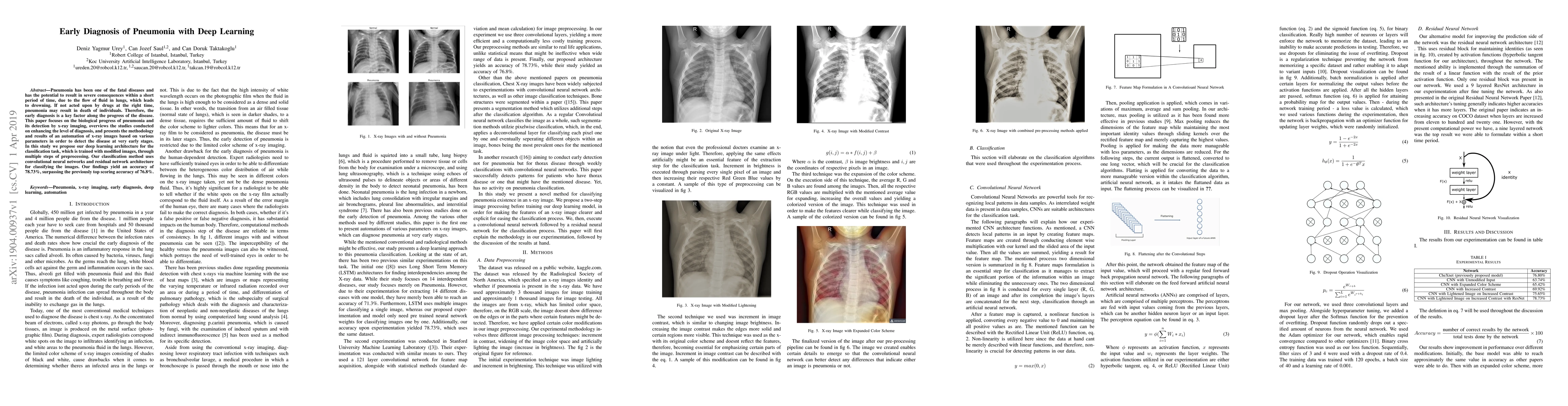 Pneumonia has been one of the fatal diseases and has the potential to result in severe consequences within a short period of time, due to the flow of fluid in lungs, which leads to drowning. If not acted upon by drugs at the right time, pneumonia may result in death of individuals. Therefore, the early diagnosis is a key factor along the progress of the disease. This paper focuses on the biological progress of pneumonia and its detection by x-ray imaging, overviews the studies conducted on enhancing the level of diagnosis, and presents the methodology and results of an automation of xray images based on various parameters in order to detect the disease at very early stages. In this study we propose our deep learning architecture for the classification task, which is trained with modified images, through multiple steps of preprocessing. Our classification method uses convolutional neural networks and residual network architecture for classifying the images. Our findings yield an accuracy of 78.73%, surpassing the previously top scoring accuracy of 76.8%.