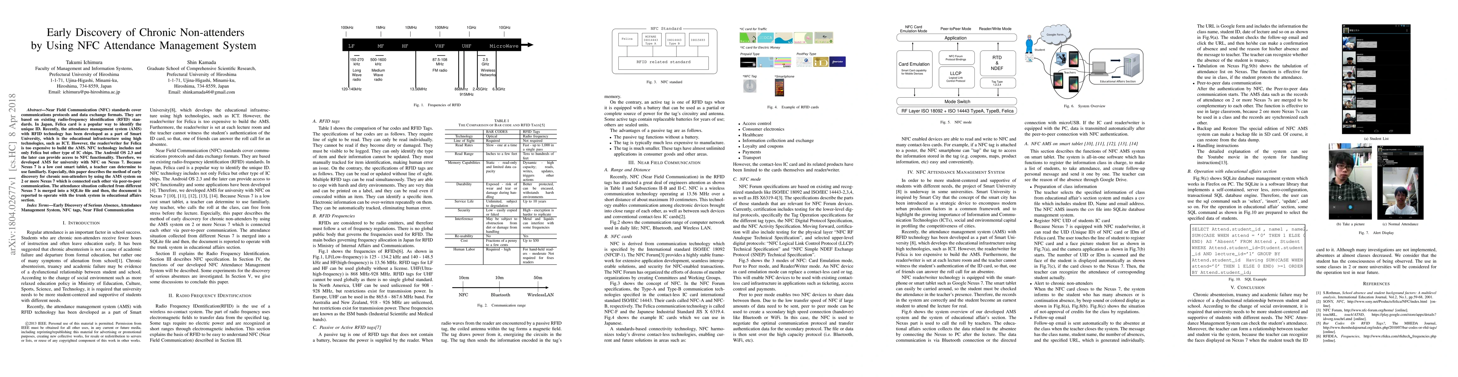 This paper presents an NFC-based attendance management system using low-cost Nexus 7 tablets to identify chronic non-attenders early. The system employs peer-to-peer communication between Nexus 7 devices to collect and merge attendance data, which is then reported to the educational affairs section for intervention.