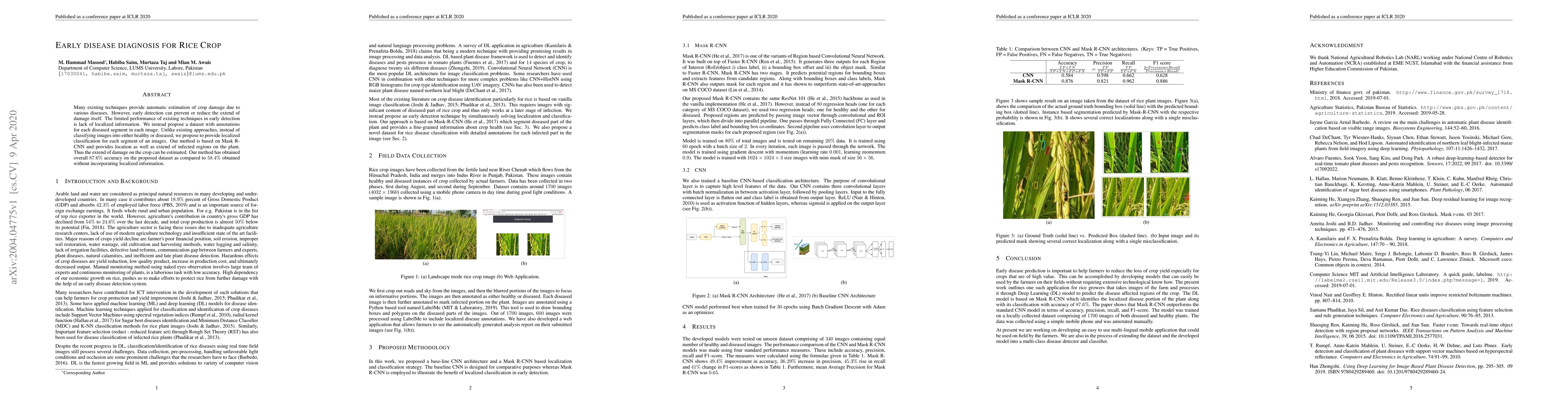 A new method for early disease diagnosis in rice crops has been proposed, using Mask RCNN to provide localized classification of infected regions, achieving 87.6% accuracy on a proposed dataset.