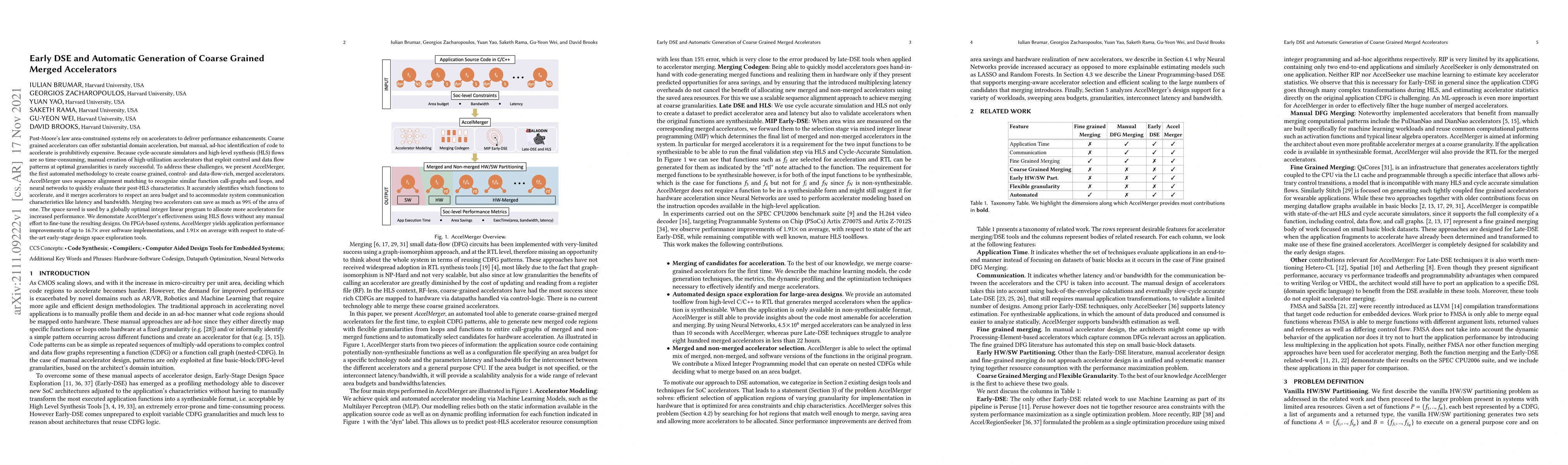 The paper introduces AccelMerger, an automated methodology for generating coarse-grained merged accelerators to enhance performance in area-constrained systems. It uses sequence alignment and neural networks to identify and merge accelerators efficiently, achieving up to 16.7x performance improvement on FPGAs compared to software implementations.