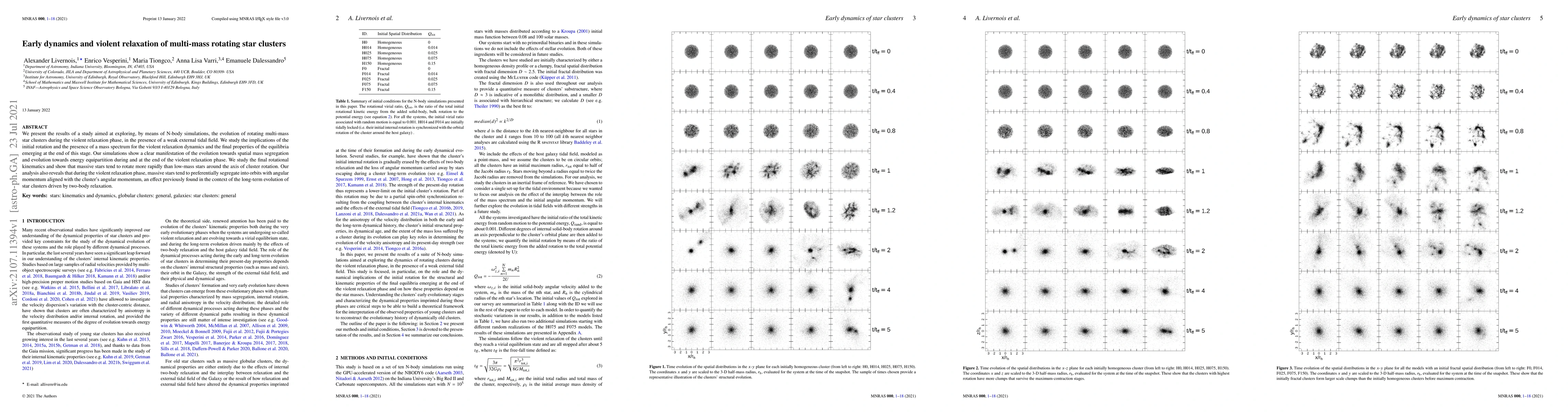 This study uses N-body simulations to investigate the violent relaxation dynamics of rotating multi-mass star clusters under a weak external tidal field, revealing spatial mass segregation and energy equipartition. The analysis shows that massive stars rotate faster and align their angular momentum with the cluster's rotation axis, highlighting the influence of initial rotation and mass spectrum on cluster evolution.