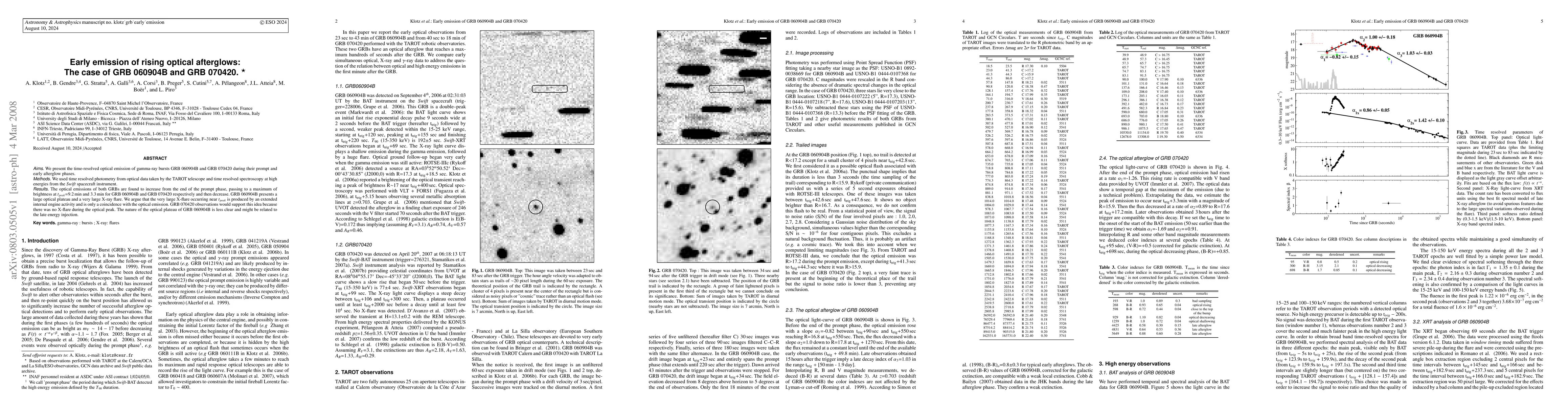 We present the time-resolved optical emission of gamma-ray bursts GRB 060904B and GRB 070420 during their prompt and early afterglow phases. We used time resolved photometry from optical data taken by the TAROT telescope and time resolved spectroscopy at high energies from the Swift spacecraft instrument. The optical emissions of both GRBs are found to increase from the end of the prompt phase, passing to a maximum of brightness at t_{peak}=9.2 min and 3.3 min for GRB 060904B and GRB 070420 respectively and then decrease. GRB 060904B presents a large optical plateau and a very large X-ray flare. We argue that the very large X-flare occurring near t_{peak} is produced by an extended internal engine activity and is only a coincidence with the optical emission. GRB 070420 observations would support this idea because there was no X-flare during the optical peak. The nature of the optical plateau of GRB 060904B is less clear and might be related to the late energy injection.