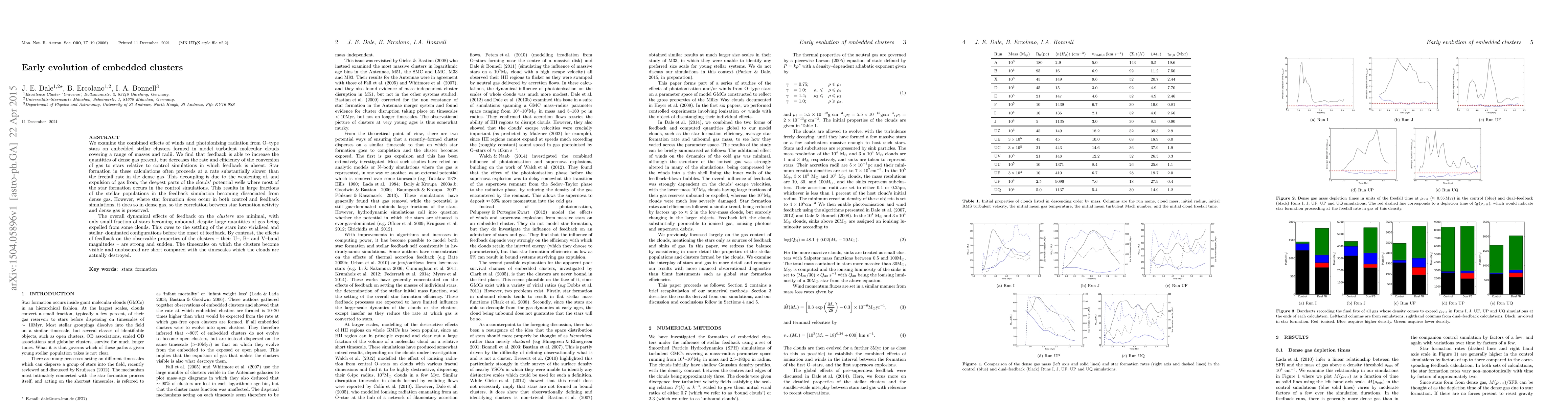 We examine the combined effects of winds and photoionizing radiation from O--type stars on embedded stellar clusters formed in model turbulent molecular clouds covering a range of masses and radii. We find that feedback is able to increase the quantities of dense gas present, but decreases the rate and efficiency of the conversion of gas to stars relative to control simulations in which feedback is absent. Star formation in these calculations often proceeds at a rate substantially slower than the freefall rate in the dense gas. This decoupling is due to the weakening of, and expulsion of gas from, the deepest parts of the clouds' potential wells where most of the star formation occurs in the control simulations. This results in large fractions of the stellar populations in the feedback simulation becoming dissociated from dense gas. However, where star formation \emph{does} occur in both control and feedback simulations, it does so in dense gas, so the correlation between star formation activity and dense gas is preserved. The overall dynamical effects of feedback on the \emph{clusters} are minimal, with only small fraction of stars becoming unbound, despite large quantities of gas being expelled from some clouds. This owes to the settling of the stars into virialised and stellar--dominated configurations before the onset of feedback. By contrast, the effects of feedback on the observable properties of the clusters -- their U--, B-- and V--band magnitudes -- are strong and sudden. The timescales on which the clusters become visible and unobscured are short compared with the timescales which the clouds are actually destroyed.