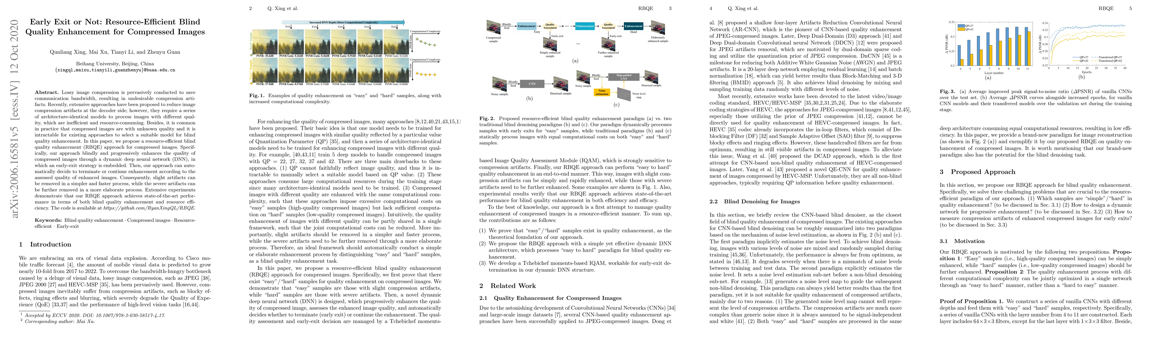 This paper proposes a resource-efficient blind quality enhancement (RBQE) approach for compressed images using a dynamic deep neural network with an early-exit strategy to progressively enhance image quality, achieving state-of-the-art performance in both blind quality enhancement and resource efficiency.