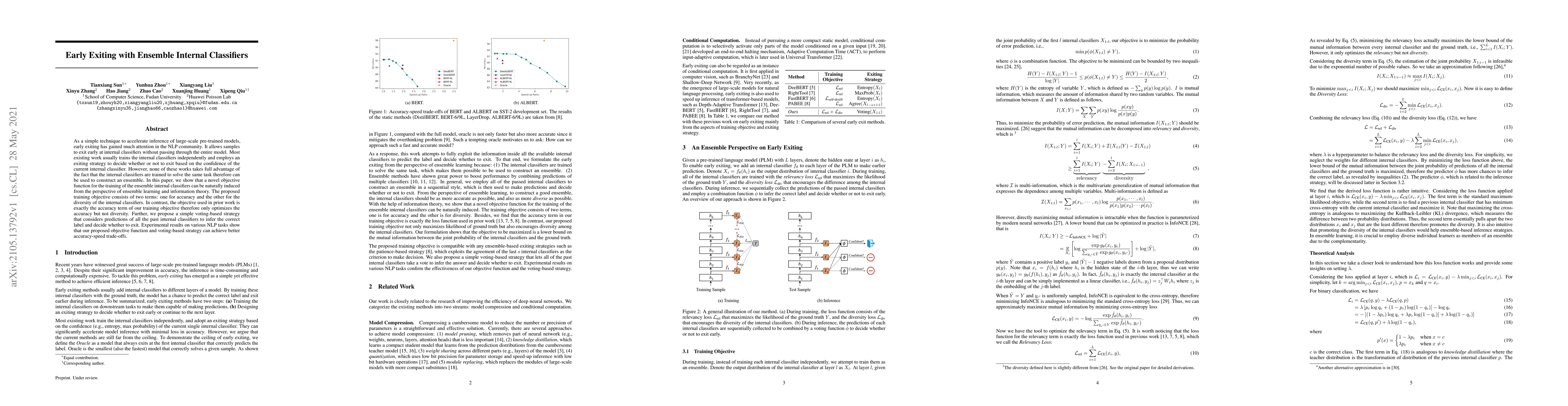 This paper proposes a novel objective function to train ensemble internal classifiers for early exiting in NLP models, emphasizing both accuracy and diversity. The new approach, combined with a voting-based strategy, achieves better accuracy-speed trade-offs compared to existing methods that focus solely on accuracy.
