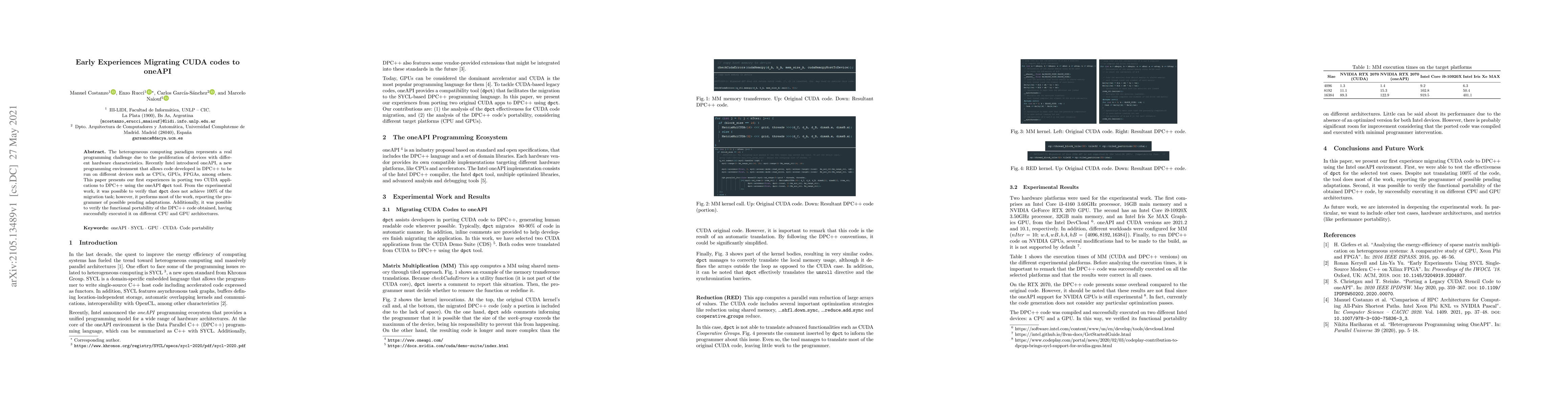 This paper shares initial experiences migrating CUDA applications to DPC++ using Intel's oneAPI, revealing that while the dpct tool automates most migration tasks, some adaptations remain necessary. The resulting DPC++ code successfully executed on various CPU and GPU architectures, demonstrating functional portability.