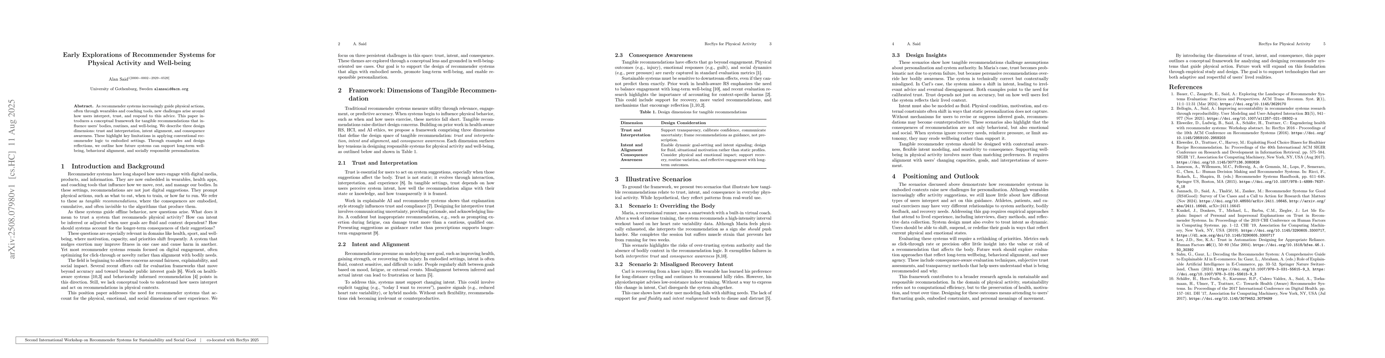 The paper introduces a conceptual framework for tangible recommendations in physical activity and well-being, focusing on three dimensions: trust and interpretation, intent alignment, and consequence awareness.
