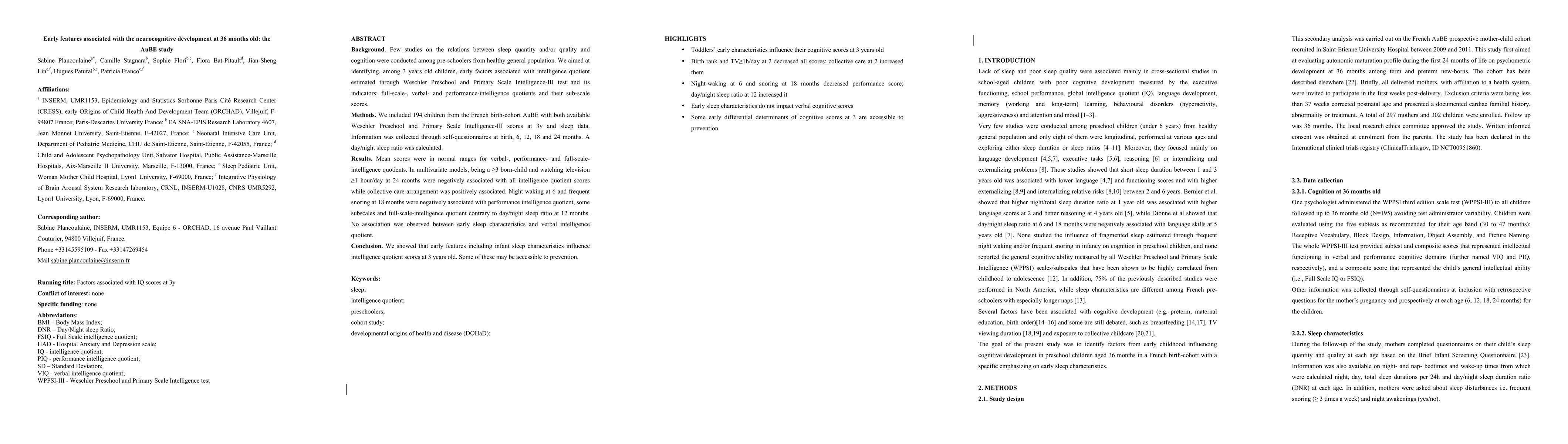 The AuBE study identified early factors, including sleep characteristics and television watching, associated with neurocognitive development at 36 months, showing that certain early sleep issues and media exposure negatively impact intelligence quotient scores. Collective care arrangements were found to have a positive influence.